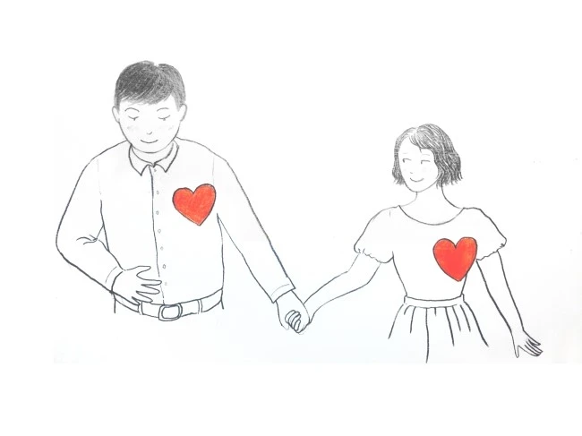 식탁에 둘러 앉은 사람들은 모두 가슴에 커다란 하트를 붙이고 줄리아의 요리를 즐기고 있다.