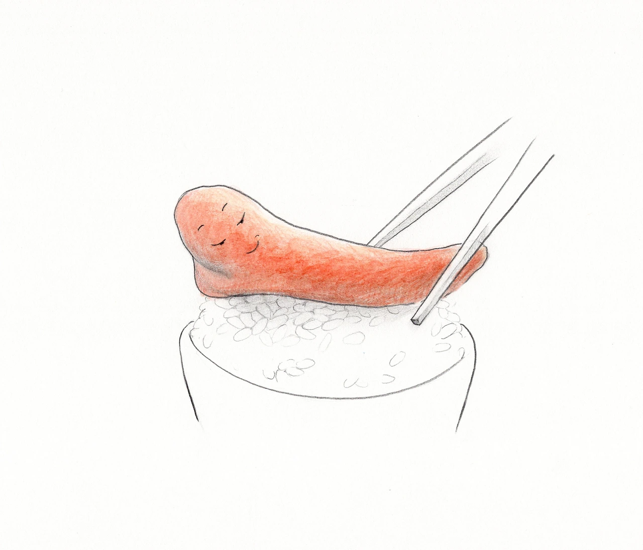 한 토막을 밥 위에 올려서 젓가락으로 눕히듯 누르면 분홍색알들이 밥 위에 녹듯이 퍼진다.