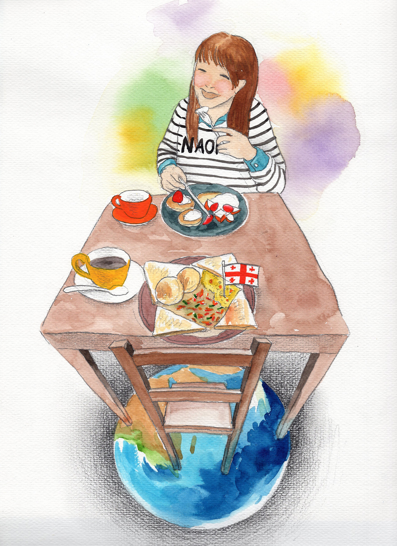 나는 Chizi Bizhi라는 메뉴를 주문했다. 조지아식 아침식사 메뉴다. 나오코가 그거 혼자 먹기는 좀 많아 라고 충고했지만, 조지아 식당에 왔으니까 무난한 팬케이크보다는 조지아식 아침식사를 먹어보기로 했다. 조지아식으로 만든 홈메이드 소시지, 마늘, 허브, 토마토와 섞은 스크램블 에그, 베이컨, 익힌 콩과 토스트가 나왔다. 베이컨과 홈메이드 소시지도 맛있었지만, 익힌 콩요리에 빵을 찍어먹는 것이 정말 맛있었는데 보통의 베이크드 빈(baked bean)처럼 케첩 소스가 아니라, 갈색의 좀 더 부드럽고 온화하면서 걸쭉한 죽 같은 것으로 콩 특유의 고소한 맛이 나면서 입안이 든든해지는 맛이었다. 양이 적지 않았지만 남기지 않고 전부 먹었다. 나오코가 자신이 주문한 팬케이크를 조금 덜어주었을 때도 거절하지 않았다.