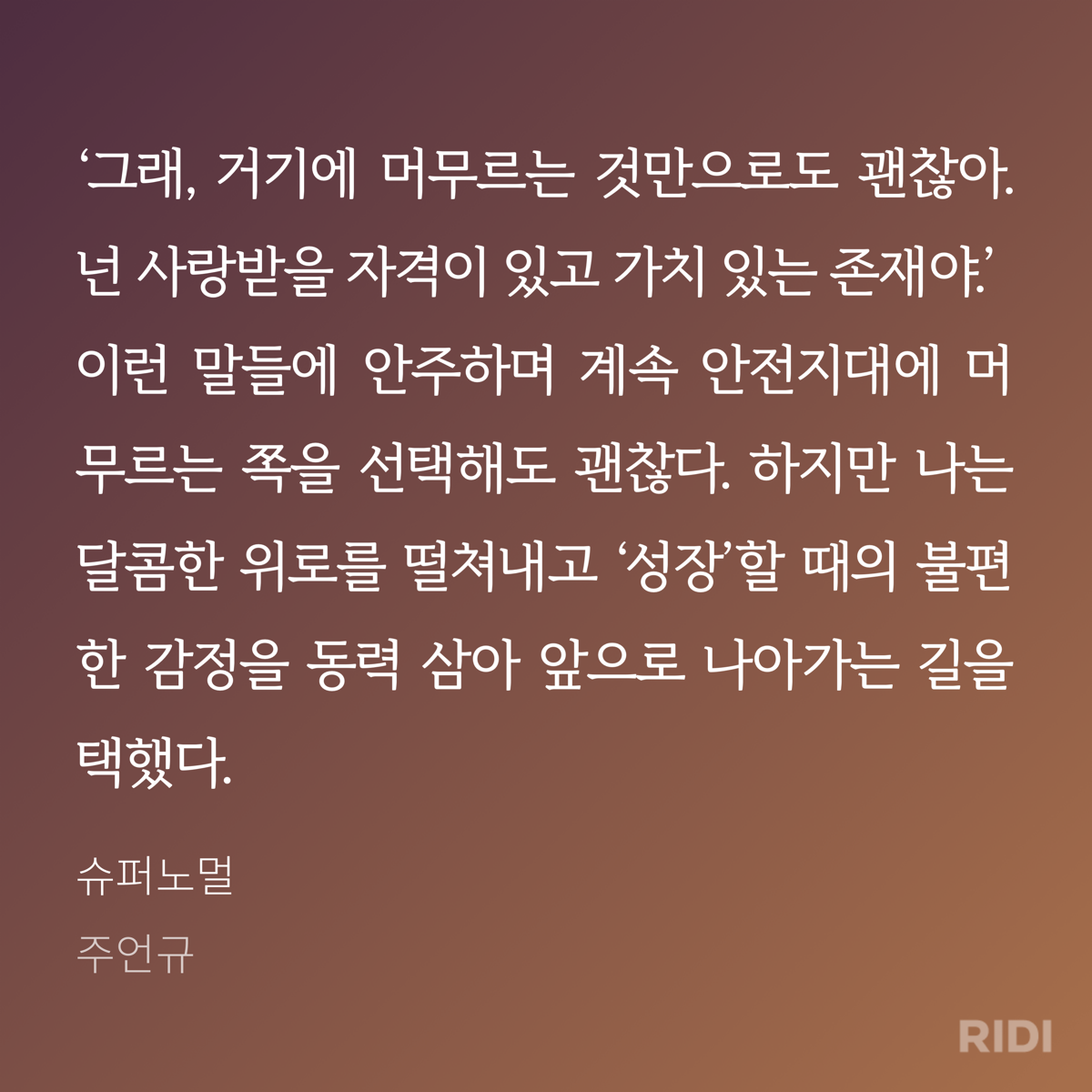 "지금 있는 그 자리에 머물러도 좋다. 하지만 몸을 쓰지 않을수록 근력을 잃게 되듯이 당신의 안전지대는 필연적으로 점차 좁아질 것이다", <<슈퍼노멀>> 책의 내용이다. 아마 내 컴포트존이 좁아졌는지도 모르겠다.