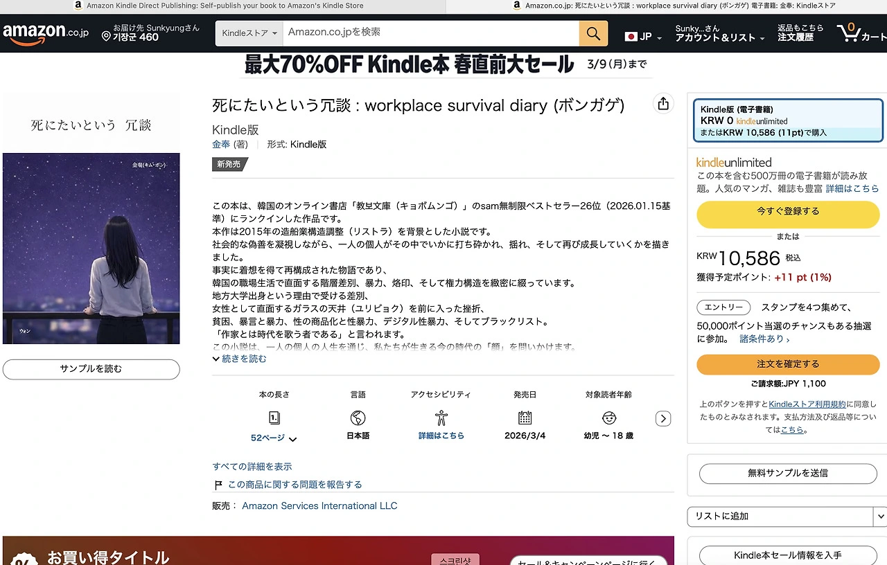 죽고 싶다는 농담 일본어판이 아마존 킨들에서 판매를 시작했습니다.