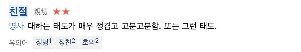 그렇다. 친절함이란 정이 넘치고 매우 다정하며 고분고분한 태도를 뜻하는 말이다.