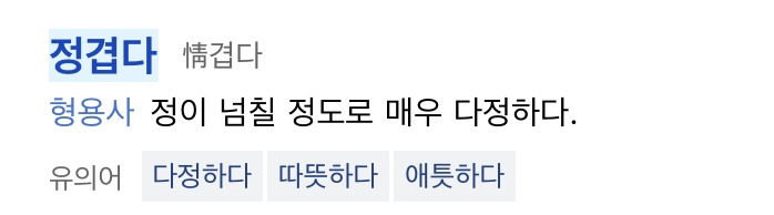 라고 국어사전에서는 정의하고 있다. 여기 정겹다는 말이 나오는데 또 정겹다는 말의 의미는 이러하다.