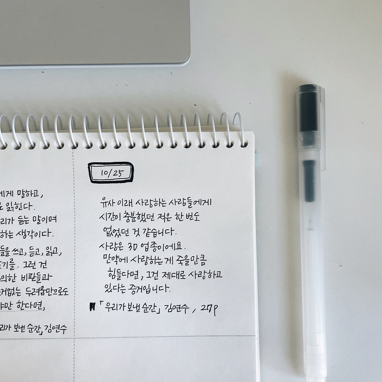 김연수의 [우리가 보낸 순간]을 읽다가 필사를 한다. 사랑은 3D 업종이란다. 그렇다면 다행이다. 마음만 고쳐 먹으면 할 수 있는 일이기 때문이다. 중년이 된 딸은 점점 기력이 다하는 백발 친정엄마 앞에서 좋은 것도 보여드리고 맛있는 것도 먹여드리겠다고 마음을 먹어 본다.