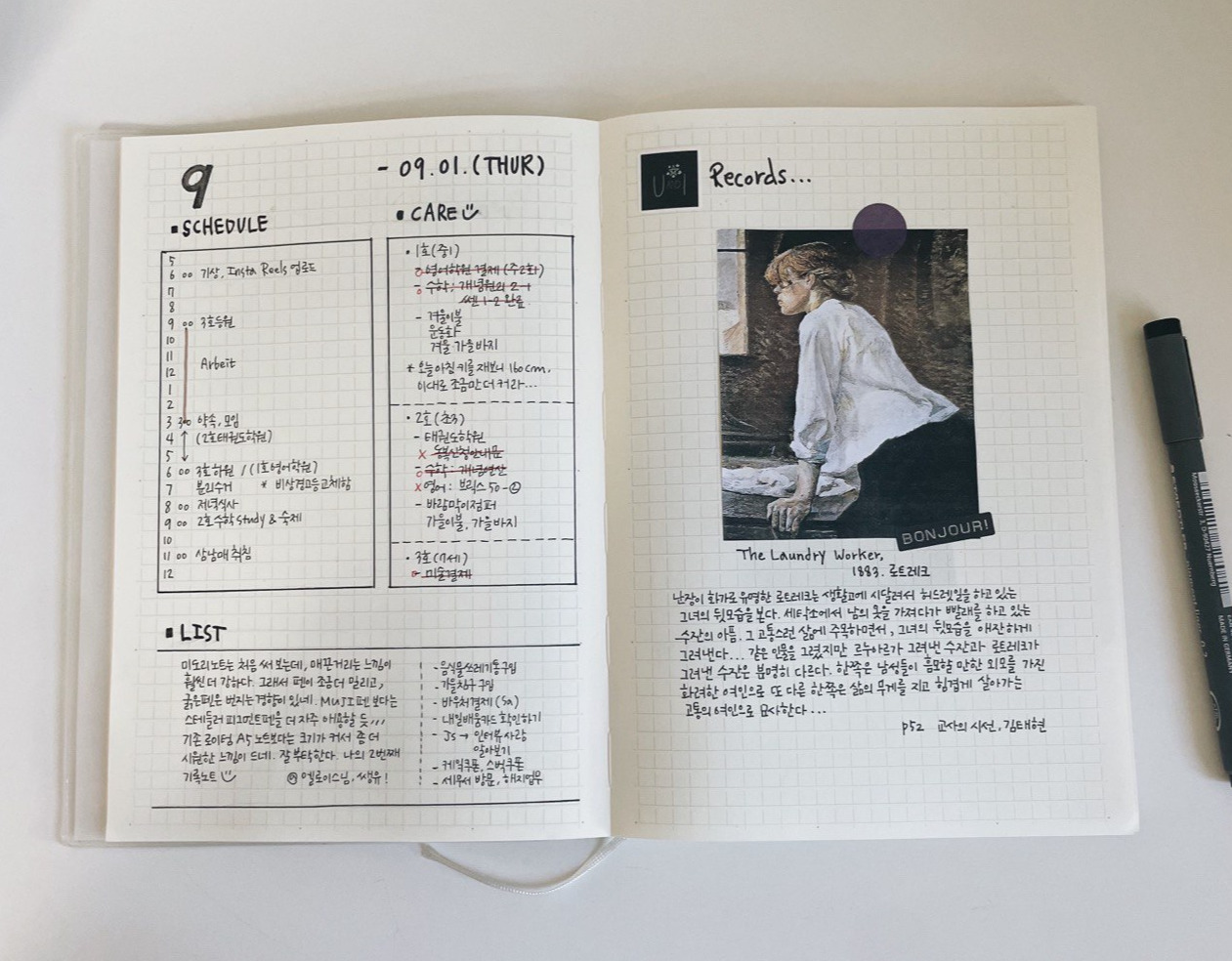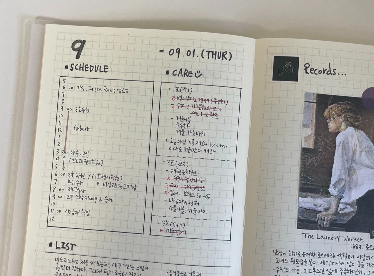 일기 쓰는 것을 좋아한다. 그림일기에서 부터 한 줄일기, 세 줄 일기, 감사 일기, 모닝 페이지, 만년 일기까지 다양한 일기를 쓰고 기록해 오고 있다. 쓰다 보니 '장비병'도 생겨서 온갖 문구류를 섭렵하여 요즘은 아예 인스타그램에 기록 계정을 만들어놓고 일기와 문구류를 자랑하는 재미로 살고 있다.