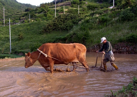 ▲ 다랑논 써레질하는 농부와 누렁이, 남해 가천다랭이마을 ⓒ밤이슬이(http://blog.naver.com/pms8206/)