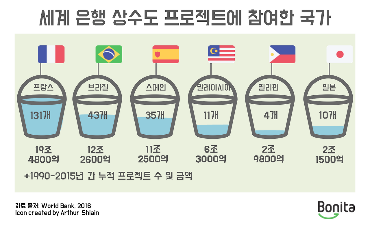 수도 민영화를 반대하는 세계적인 흐름은 점점 더 거세지고 있습니다. 2007년 세계은행의 수도 민영화 프로젝트는 85개에 달했지만, 2013년도에는 22개로 줄었습니다. 이는 지난 10년간 진행됐던 다른 프로젝트에 비해 실패율이 높았기 때문입니다. 민영화 실패율을 보면, 수도 34%, 에너지 6%, 대중교통 3%로, 다른 분야에 비해 꽤나 높은 기록을 보이고 있습니다.