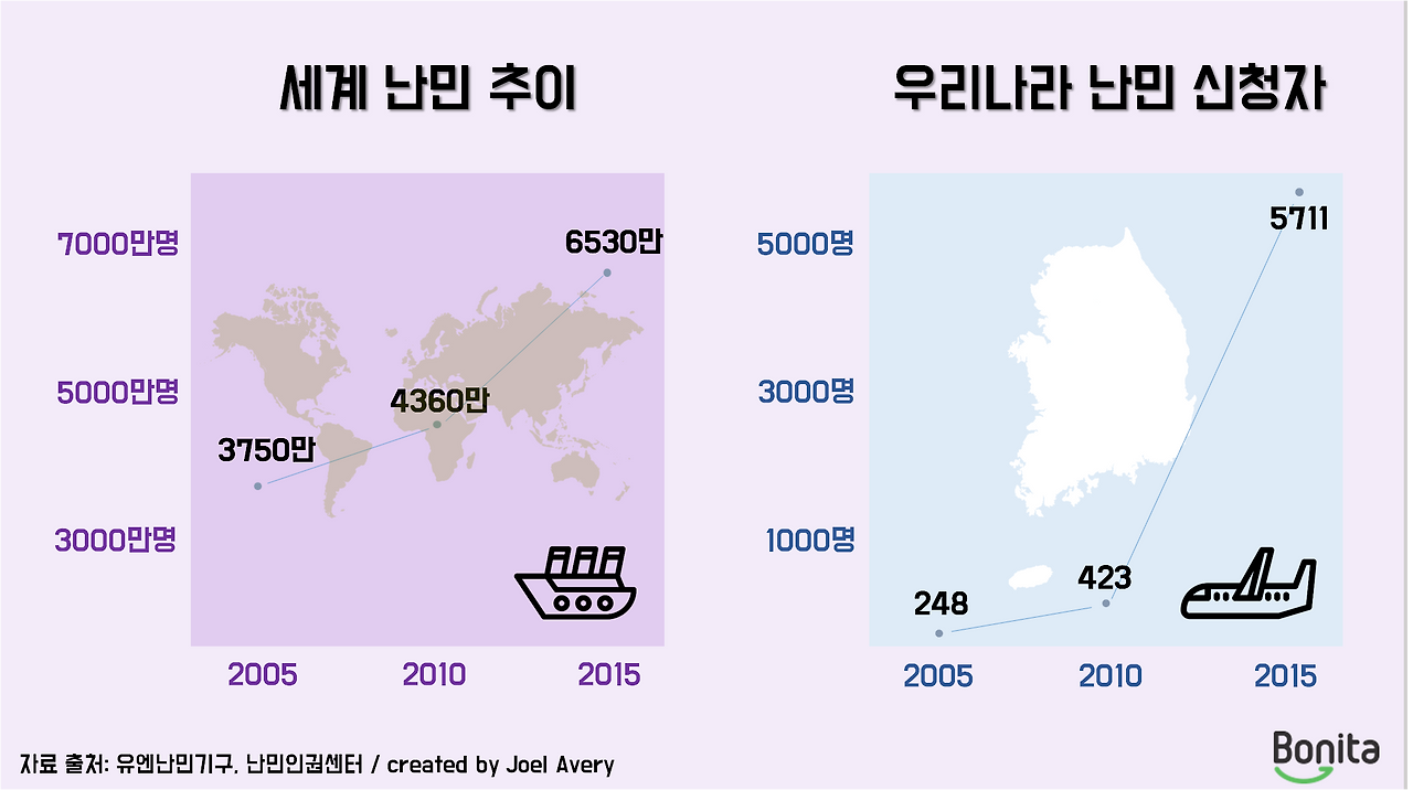 난민이 유럽으로만 향하는 것은 아닙니다. 작년에 우리나라에 도움을 청한 난민 수만 5,700명이었습니다. 하지만 안타깝게도 이들 대부분이 난민 지위를 얻지 못했습니다. 우리나라는 2013년 아시아 최초로 난민법을 시행하며 이 문제에 앞장서는 모습을 보였지만, 정작 난민인정비율을 3.4%밖에 되지 않습니다. OECD 국가들이 평균 난민 신청자의 35%를 난민으로 인정하는 것에 비하면 그 비율이 매우 저조할 따름입니다. 이 수치는 난민을 바라보는 우리의 시선을 고스란히 보여주고 있습니다.
