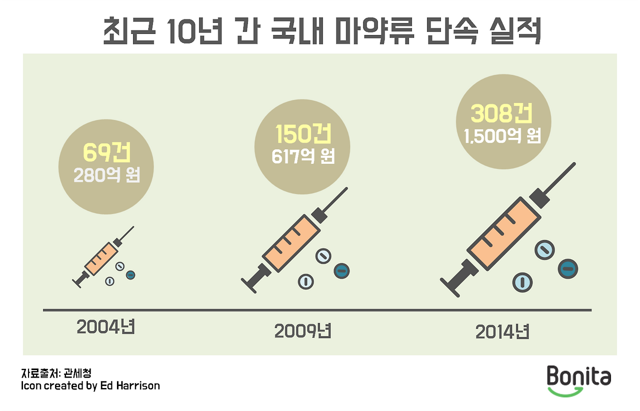 하지만, 더 이상 안심할 수 없습니다. 2015년 적발된 마약 사범은 총 1만 1,916명으로 마약청정국 지위가 위협당하고 있기 때문입니다. 더구나 일 년 사이 19.4%나 증가한 수치이기 때문에 더욱 심각한 상황입니다.