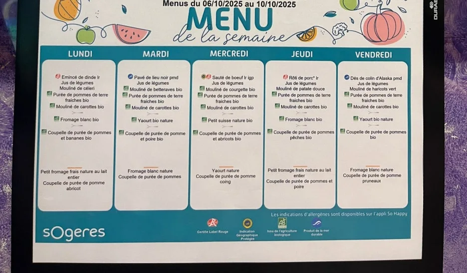 식사는 요일별로 다양한 육류(닭, 오리, 돼지, 소)와 생선류(대구, 명태)와 야채 (당근, 감자, 호박 등) 퓌레가 함께 나와요. 간식시간에는 다양한 과일 퓌레와 플레인 요플레 혹은 Fromage blanc이 나오고요.