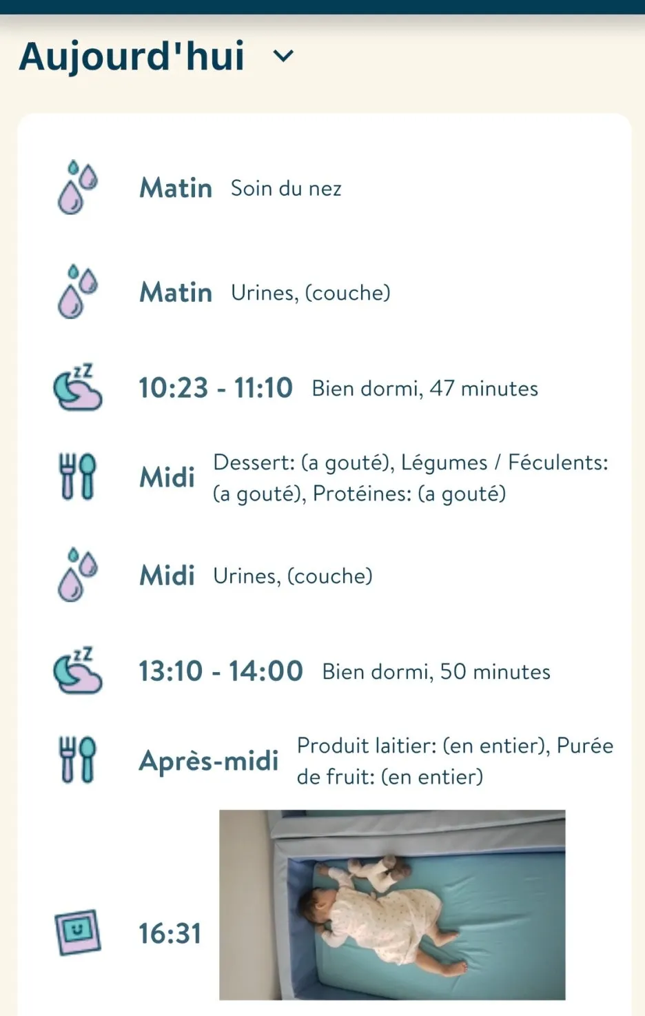 프랑스도 이렇게 어플에 하루 종일 아이가 뭘 했는지 기저귀는 언제 갈아줬고, 언제 얼마나 잤고, 뭘 먹었는지, 특이사항이 있는지 적어줘요. (기대가 없어서 그런지, 생각보다 잘 돼있는 시스템ㅎㅎ) 귀여운 사진도 이렇게 가끔 찍어주신다고^^