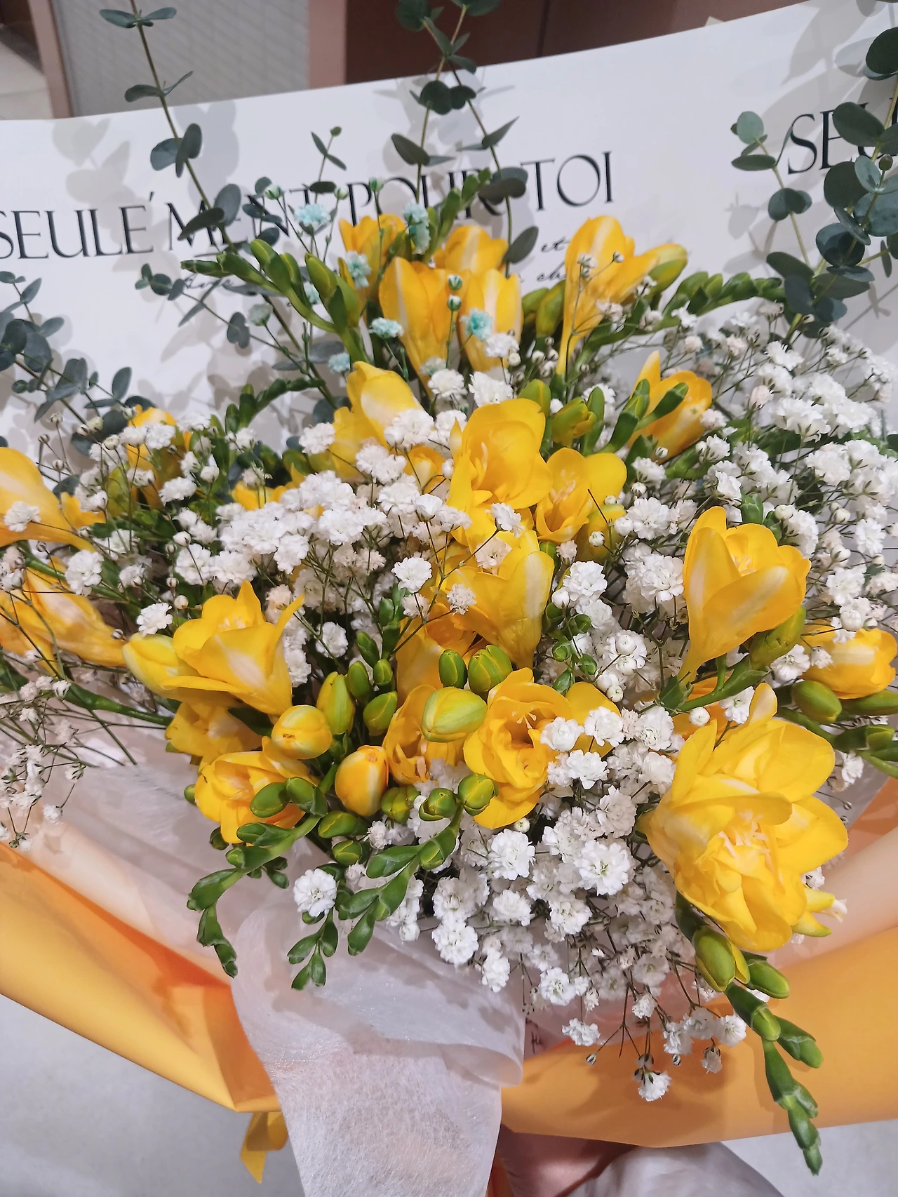 아이가 남자이기 때문에 분홍 계열 장미류 보다는 프리지아에 더 눈이 갔다. 노랗고 소박하면서도 흐드러지는 느낌의 귀여운 꽃이다. 안개꽃과 같이 다발로 만들어 놓은 것을 보니 환하고 화려했다. 내 눈길을 알아챘는지 꽃집 사장님이 얼마짜리 원하냐고 했다. 가격을 말하니 전시된 거보다 더 크게 만들어준다고 장담한다.