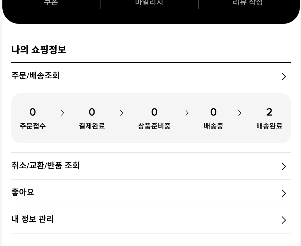 나의 쇼핑정보 ( 주문 배송조회, 취소/교환/반품, 좋아요, 내 정보관리)