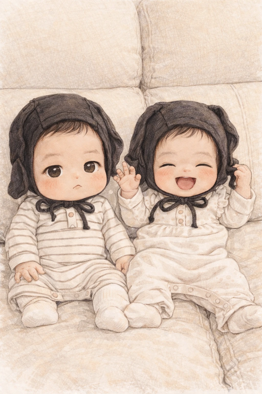 엄마의 눈에는 너희 둘 다 이미 같은 ‘뒤집기’라는 방향을 향해 가고 있어. 빠르거나 느리다는 기준보다 더 중요한 것은, 너희가 멈추지 않고 자기만의 방식으로 자라나고 있다는 사실이야.