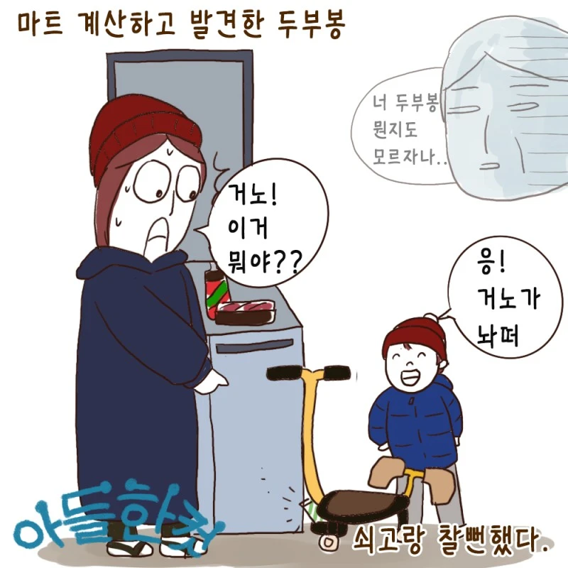 아들이 타고 다니는 디라인 안장 아래 보면 작게 수납할 수 있는 받침대가 하나 있는데 여기에다가 두부봉을 담아놓은 걸 나중에야 발견했다. 두부봉은 산적도 없고 먹은 적은 더더군다나 없는데 두부봉이 놓인 위치가 아들이 손에 닿기 쉽게 있어서 흥미를 자극했나 보다. 그 뒤로도 두부봉만 보면 한동안 자꾸 카트에 담아서 매번 빼야 됐었다. 만약에 이대로 나갔으면 어휴 생각하기도 싫다. 완전 도둑 될 뻔.