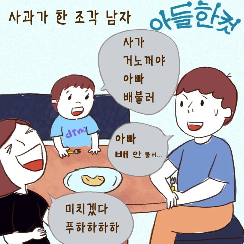 밥을 다 먹고 사과를 하나 잘라서 나눠 먹었다. 보통은 아들 접시를 따로 해서 주는데 귀찮아서 그냥 하나에 두고 먹었더니 셋이서 사과 하나 먹기 금방 동이 나고 한 조각이 남았다. 하나 남았는데 이거 누가 먹어? 그랬더니 아들이 아빠 배부르다고 자기 거란다. 아들 말 덕분에 한참 웃고 그럴 땐 먹고 싶다고 하는 거라고 알려줬다. 할 수 있는 말은 적어도 응용할 줄은 아는구나.