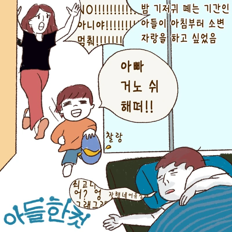 밤 기저귀 과도기를 겪고 있는 아들. 좀 더 응원해 주기 위해 뽀송뽀송한 상태로 일어나면 폭풍 칭찬을 해준다. 밤중 소변을 참고 일어나 본인 전용 소변기에 소변 하는 게 아침 루틴인데 (기저귀에 소변을 한 날도 한번 정도라 아침 소변은 꼭 싸도록 함.) 엄청나게 많이 싼 날 스스로가 무척 대견했는지 싸자마자 소변통을 들고 남편에게 가서 보여주었다. 너무 찰랑거렸던 소변이 약간의 참사를 유발하고 자다가 소변 맞은 남편이 아주 난리 나고 난 나대로 아침 준비하다가 깜놀하고.... 결국 이불빨래를 해야 했다. 그 뒤로는 본인도 아니다 싶었는지 소변 자랑하고 싶을 땐 엄마 아빠를 부른다. 가끔 응가도 자랑하기도 함.