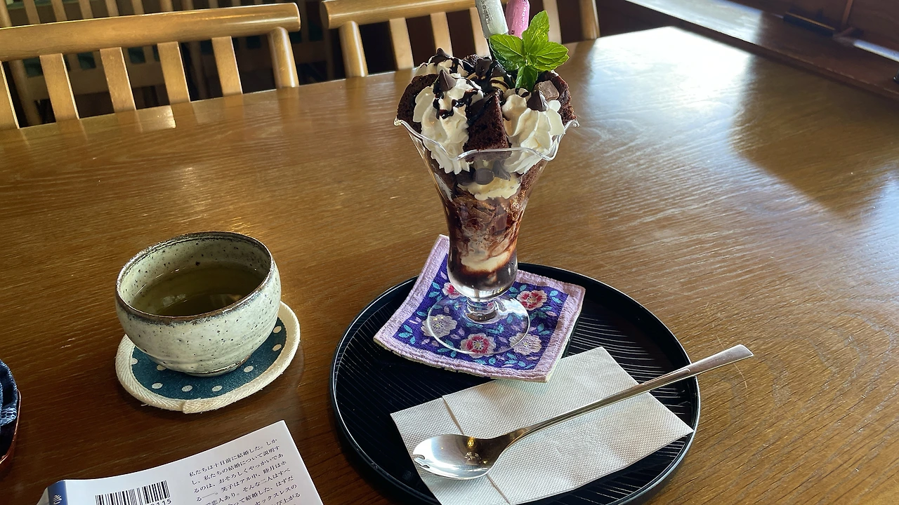 보자마자 욱 하고 위에서 거부하는 느낌이 났다. 파르페 잘못이 아니었다. 아침에 커피 푸딩도 먹고, 곧바로 케이크와 커피를 먹은 내 잘못이었다. 맛은 있었지만 초콜릿의 달달함과 생크림에 결국 항복했다. 혼자 여행하면서 이런 점이 아쉽다. 종류별로 음식을 즐기지 못하고 한 가지만 선택한 후 다른 음식은 도전하지 못한다. 남편은 파르페를 좋아해서 같이 왔으면 두 개 정도는 거뜬하게 먹었을 텐데 하고 생각했다. 속이 안 좋아 무료로 나온 따뜻한 녹차를 계속 들이켰다.