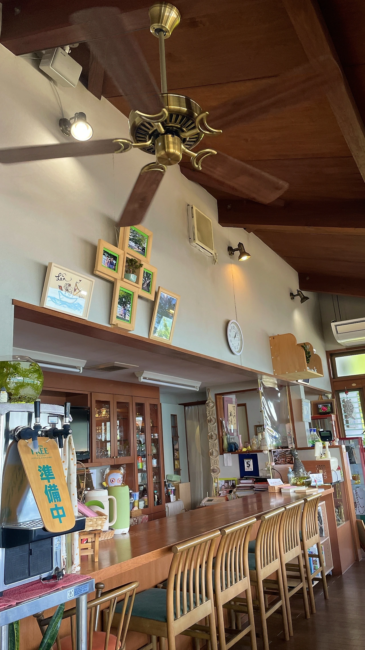 바다를 바라보며 야외 테이블에서 쉬고 싶었지만, 날이 조금 무더워져 실내로 들어왔다. 에어컨 바람이 아니어서 처음에는 실망했지만, 실내에 있는 천장 펜의 살랑거리는 바람에 가만히 앉아있으니 또 나름 시원해졌다.