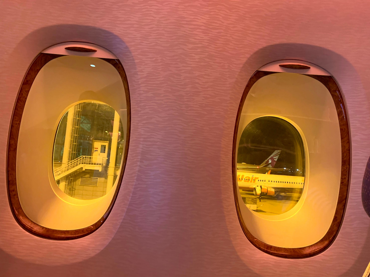 비행기만큼 자본주의 레벨이 뚜렷하게 구별되는 곳이 있을까 싶다. 그걸 또 기분 나쁘지 않게 당연하게 받아들이는 것도 인상 깊다. 앞에 앉으니 화장실 앞에 1층으로 올라가는 계단이 보이는 데 각가지 술로 가득한 바가 바로 보인다. 일등석 손님들이 아래를 내려다보며 이용할 테지. 계단 앞에는 함부로 올라갈 수 없게 줄이 쳐져 있다.
