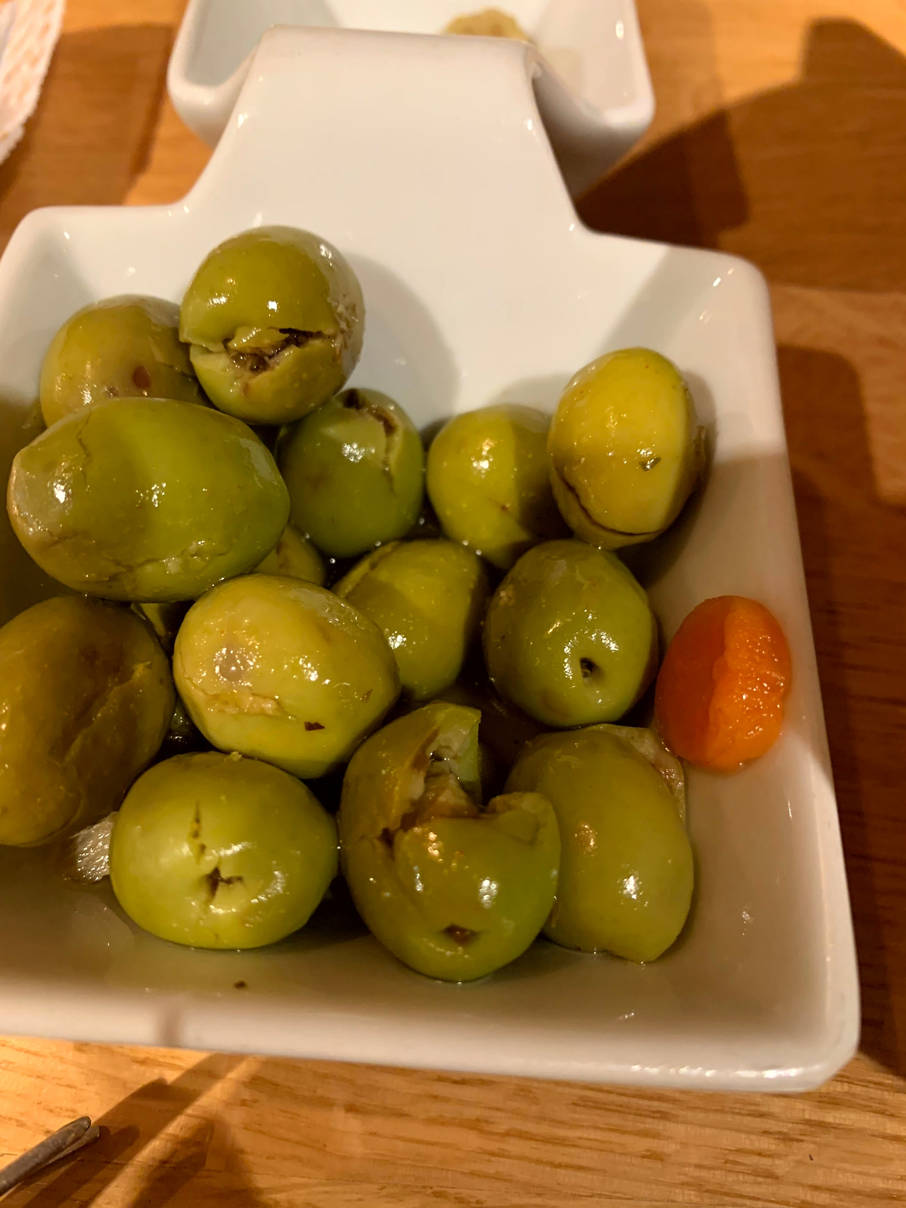 식전에 빵과 함께 나오는 올리브. 올리브 좋아하는 나로선 우리나라와 달리 실하고 큰 올리브를 얼마나 많이 먹었는지 모른다. 안에 씨앗이 들어 있는데 옆에 씨앗을 뱉어놓는 곳도 따로 있더라.