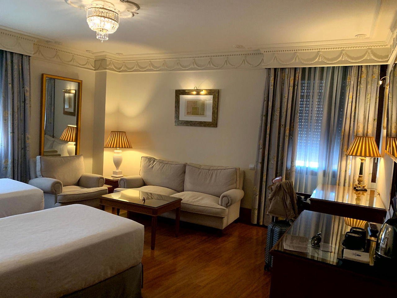 지쳐갈 때쯤 '호텔 잉글라테라'가 눈앞에 나타났다. 호텔은 누에바 광장 바로 앞에 있었다. 누에바 광장 바로 옆에는 트램 정류장도 있어서 다니기도 엄청 편했다. 호텔 입구 짙푸른 차양에 차분한 골드로 'HOTEL INGLATERRA'라고 적혀 있는데 어찌나 반갑던지. 입구에서 짐을 받아 옮겨주고 직원들 모두 친절하고 반갑게 맞이해 줬다.
