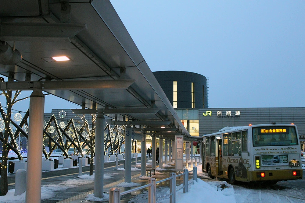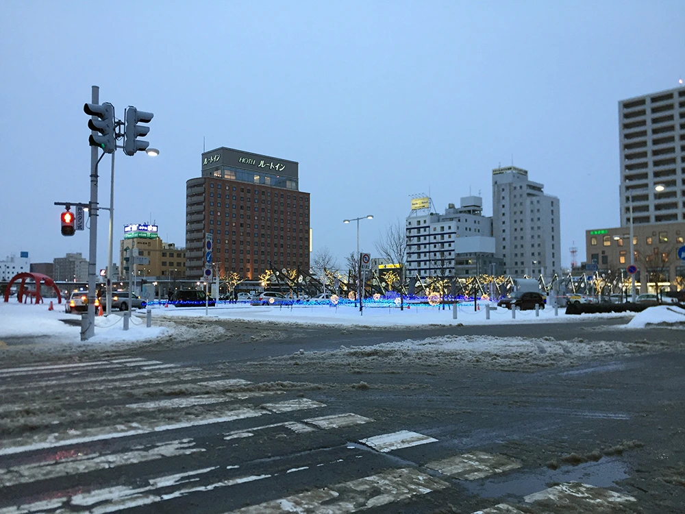 오후 4시가 다 되어 하코다테역에 도착했다. 크리스마스와 연휴는 이미 지났는데 아직도 역 앞은 반짝반짝 조명이 켜져 있다. 삿포로역보다는 작지만 훨씬 더 정겹다. 호텔은 역 앞이다. 역 앞이라고는 해도 역시 빙판길을 걸어가야 한다. 게다가 이곳은 빙판이 녹아서 질척거린다. 호텔이 너무 가깝게 표기되어 있어서 걸어가기로 한다. 역시 힘들다. 끌리지가 않으니 두 손을 안간힘을 쓰며 끌고 가야 한다.