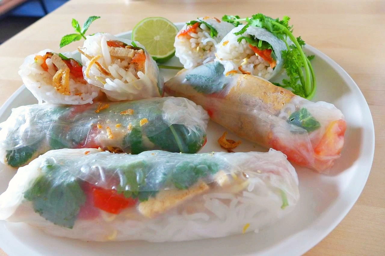 준비재료 (1-2인분): 라이스페이퍼 7-8장, 라이스누들 얇은 두께 (0.5mm, rice vermicelli noodle) 60-70g, 두부 1/2모, 간장 2 테이블스푼, 물 6스푼, 식용유 2 테이블스푼, 토마토 1개, 숙주 2줌, 고수 1 줌 (8-10줄기), 박하 1줌 (4-5줄기); 기호에 따라 고수, 박하잎 양은 조절 가능, 상추 잎으로 대체 가능.