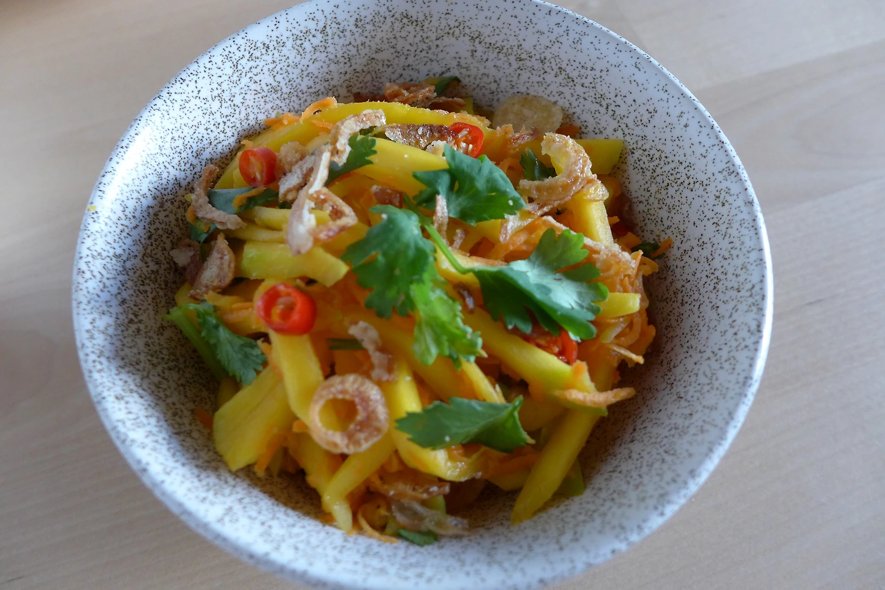 준비재료: 망고 덜 익은 것 1개, 당근 1개, 라임 1/2개, 고수 2-3줄기, 설탕 1 테이블스푼, 간장 1 테이블스푼, 물 2 테이블스푼, 태국 고추 2개. 기호에 따라 시중에 파는 튀긴 양파 (생략 가능).