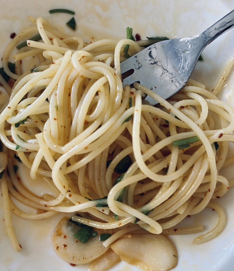 보통 알리오 올리오를 만들 때는 빨간 페페론치노를 마지막에 뿌려주는데, 오늘은 왠지 고추 향이 올리브 오일에 매콤하게 배어든 맛으로 만들고 싶어 페페론치노를 마늘과 함께 올리브 오일과 함께 볶아주었다. 덜 매콤하게 먹고 싶다면 원래 방식 그대로 마지막에 페페론치노를 뿌려먹기를 추천.
