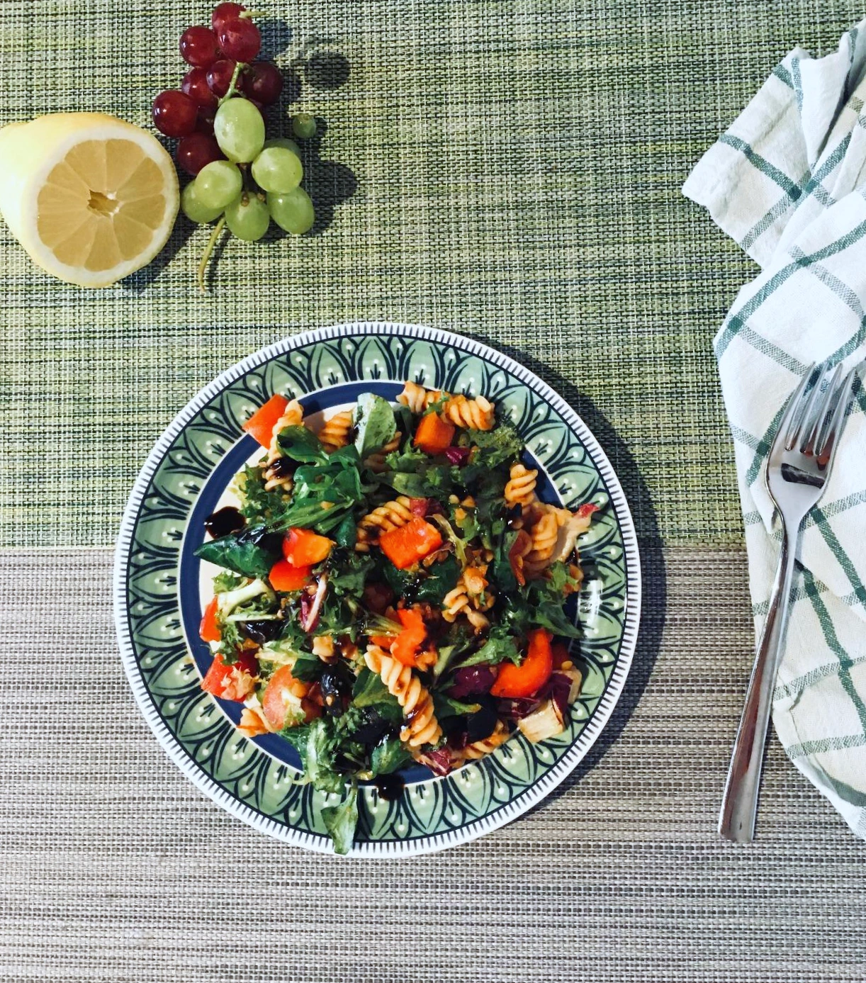준비재료 (2-3인분): 푸질리 200g, 렌틸콩 (색깔 무관) 100g, 샐러드용 채소 아무거나 100g, 토마토 중간 크기 2개, 파프리카 1개, 검은색 올리브 10개, 시판용 토마토소스 약 1/2통 (약 200g), 레몬 1/2개, 올리브유 3 테이블스푼 (밥숟가락), 소금, 후추, 기호에 맞게 발사믹 드레싱