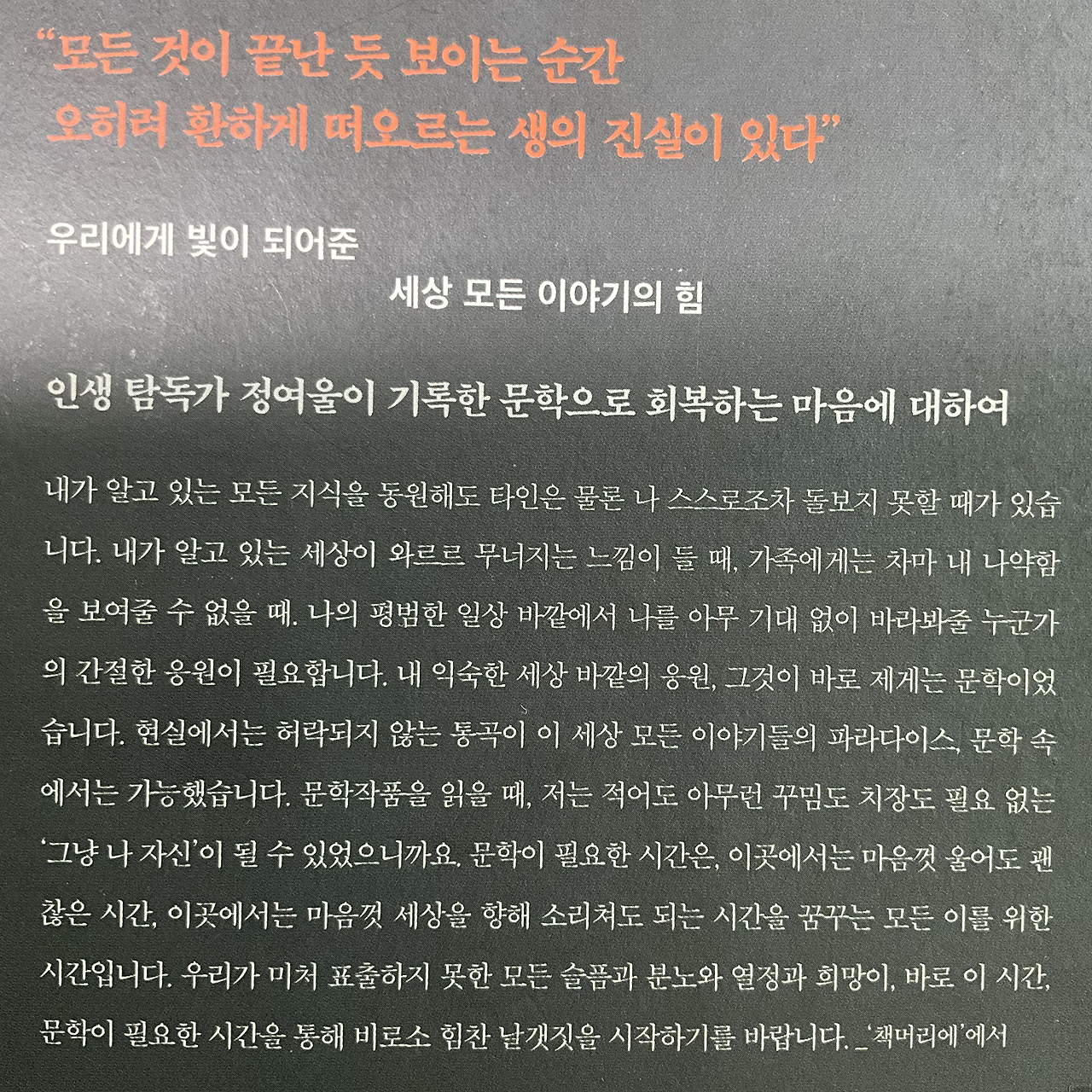 힘들게 읽었다. 단순한 서평이 아니고 문학을 통해 나를 돌봐야 하는 이야기다. 그것은 나의 상처, 운이 좋게도 아직까지 없다면 앞으로 생기게 될지도 모를 상처에 대한 대비이기도 하다. 작가는 고통에 시달리던 시절 문학을 읽고 또 문학 관련 글을 쓰면서 고통을 극복했다고 한다. 그 고통은 누군가에게는 작을 수도 있지만 어쩌면 크게 다가올 수도 있다. 하지만 고통의 크기에 상관없이 문학작품을 읽으며 그 작품 속의 인물이 되어 함께 힘들어하거나 극복을 하는 과정을 수없이 겪고 나면 괜찮았다는 말이다.