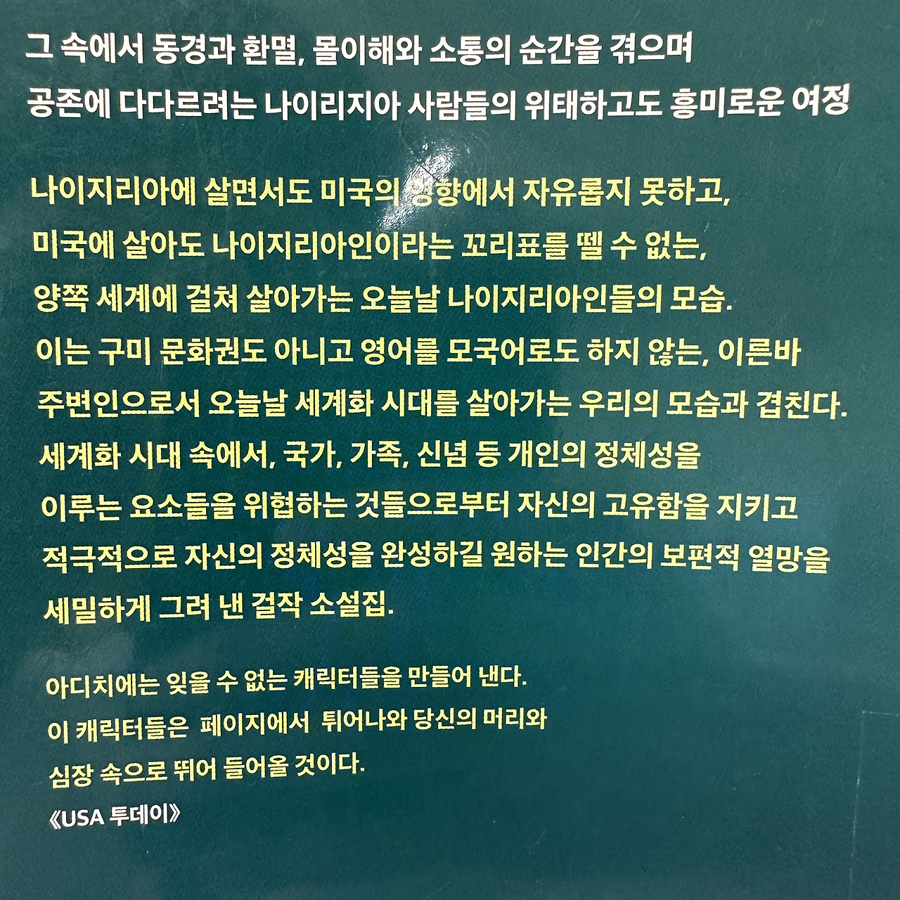 아이를 낳으러 미국에 왔을 때 처음 얼마 동안 그녀는 자랑스러운 흥분감을 느꼈다. 결혼을 통해 자신이 갈망하던 부류, ‘아내를 미국에 원정 출산 보낸 부유한 나이지리아 남자들’이라는 부류에 속하게 되었기 때문이다. 그리고 얼마 뒤에 그들이 세 들어 살고 있던 집이 매물로 나왔다. 좋은 가격이야. 오비오라는 이렇게 말하고 나서, 우리가 그 집을 살 거라고 그녀에게 말했다. 그녀는 그가 “우리”라고 말했을 때 마치 그녀에게 정말 발언권이 있기라도 한 것처럼 기분이 무척 좋았다. 그리고 자신이 또 다른 부류, ‘미국에 집이 있는 부유한 나이지리아 남자들’의 일원이 된 것도 기뻤다.