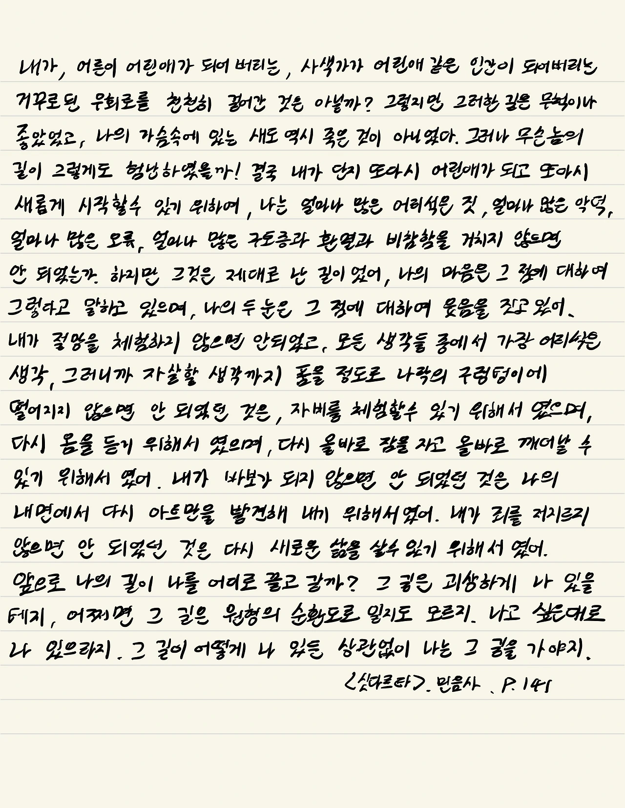 그 길이 어떻게 나 있든 상관없이 나는 그 길을 가자. 그러자. 그것을 걱정하거나 후회하지 말자. 그러자. 만약 너무 힘이 들더라도 자살보다는 살자. 그러자. 그렇게 살다 보면. 옴.옴. 옴. 내가 걷는 길이 나의 길. 꾸준하게 나의 길을 걷자. 그러자. 자문자답 같지만 우문현답은 아니다. 그렇지. 나 스스로 하는 즉문즉설이다. 그렇지. 멈추지 말고 계속 가보자. 그러자. 함께 가자.