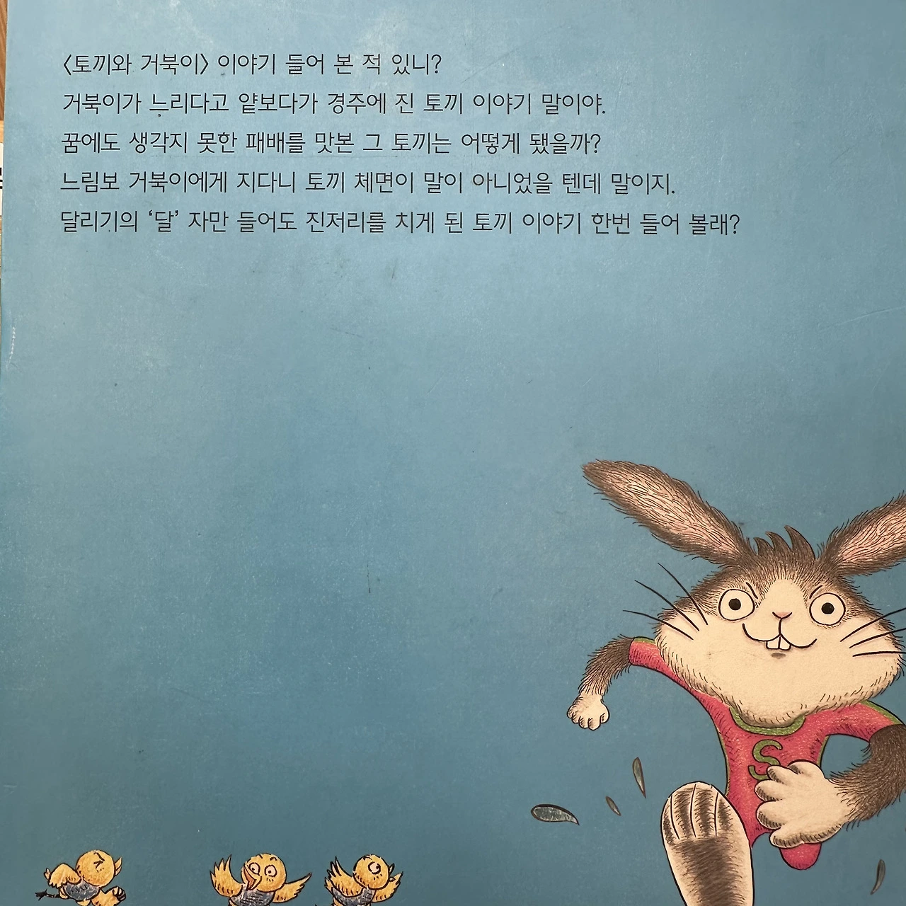 이번에는 토끼의 이야기다. 그림은 여전히 동화풍의 아름다운 그림이다. 표지는 절대로 뛰지 않겠다는 의지의 토끼 모습이 보인다. 면지에는 역시 이 작품의 프롤로그와 에필로그가 담겨 있어서 보는 재미가 있다. 이 그림책 또한 이전 작품 <슈퍼 거북>에 이어서 토끼와 거북이를 탁월하게 재해석했다. 하지만 이번에는 실패자에 좀 더 집중한 이야기다.