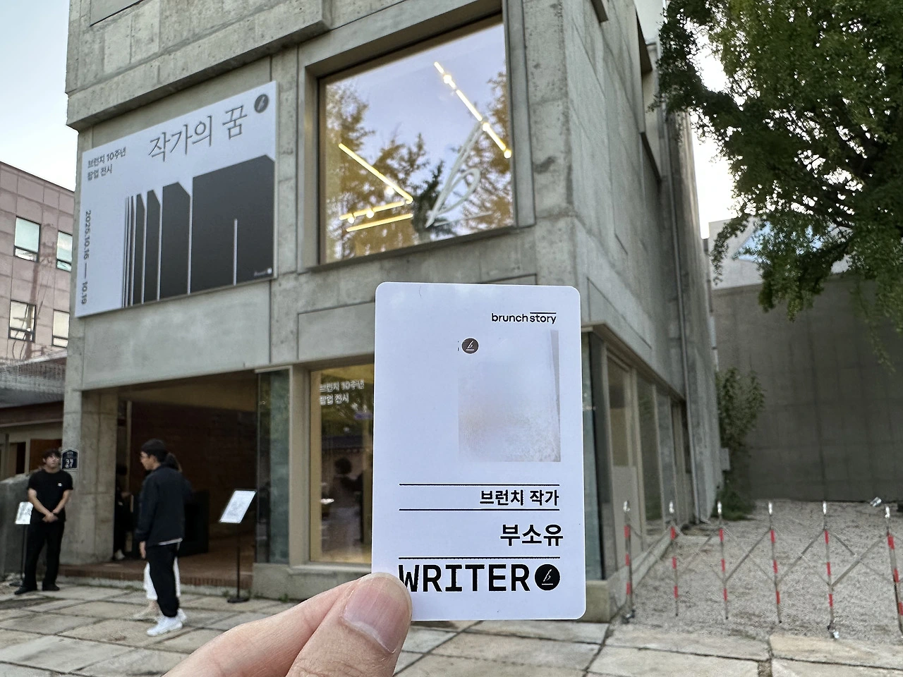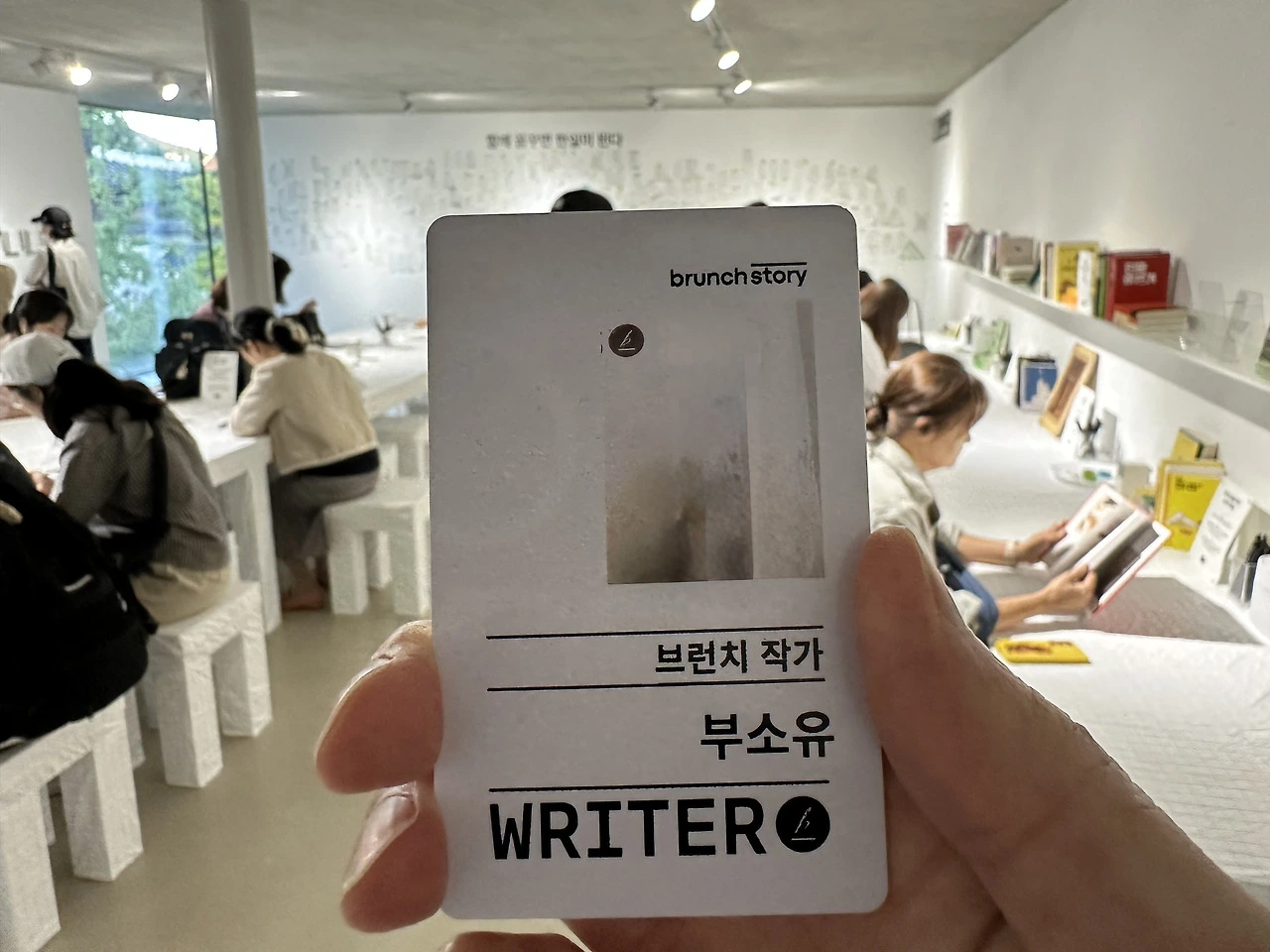 작년 브런치 팝업 전시회에서 얻은 소중한 기념품 ‘브런치 작가 명함’을 들고 제일 좋았던 공간에서 수줍게 사진을 찍었다. 아마도 저 공간에서 만났을, 혹은 오며 가며 마주쳤을, 혹은 앞으로 만나게 될 작가들을 응원한다. 나 또한 나를 격려하고 응원한다. 언젠가는 내가 바로 ‘부소유’ 작가라고 말하고 다니는 당당한 브런치 작가로 성장하기를 바라본다.