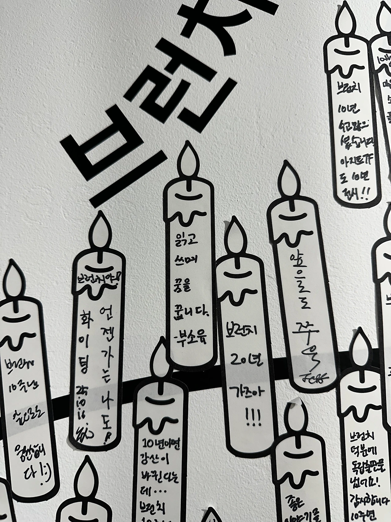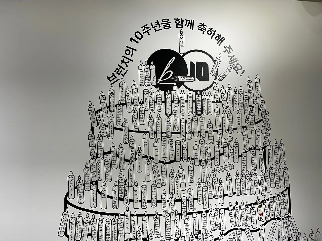 A동 B동이 있었고, A동은 브런치의 시작, 브런치가 10년간 걸어온 시간 기록물이 전시되어 있었다. 한쪽 벽면에는 거대한 케이크 그림이 있었고, 그 케이크에 축하 메시지를 써서 촛불 스티커를 붙여주는 체험 부스가 작게 마련되어 있었다. 나 역시 촛불 하나를 붙였다. 첫날부터 저렇게 많은 촛불이 쌓였는데 과연 주말에는 어떤 모습일지 궁금했다.