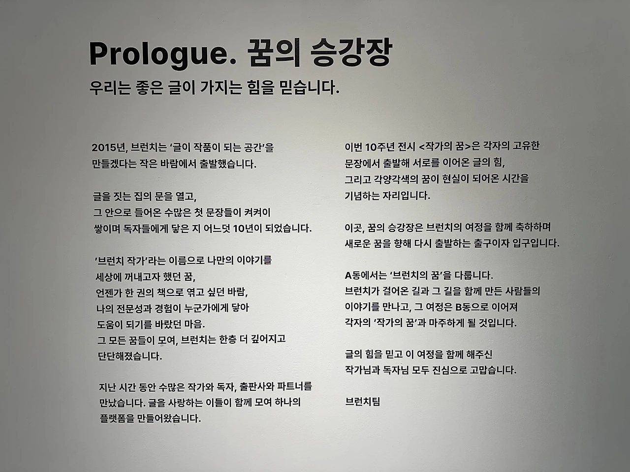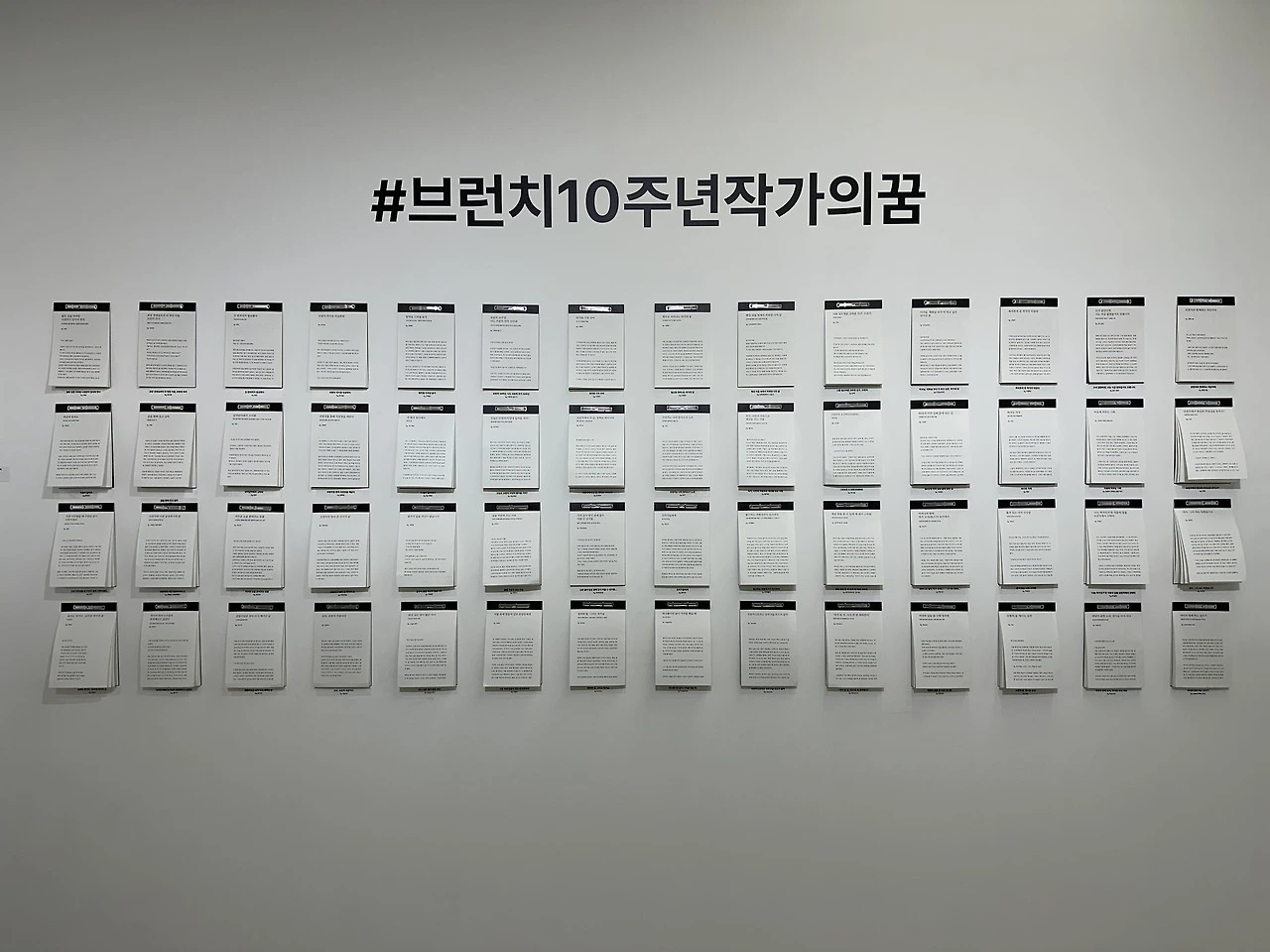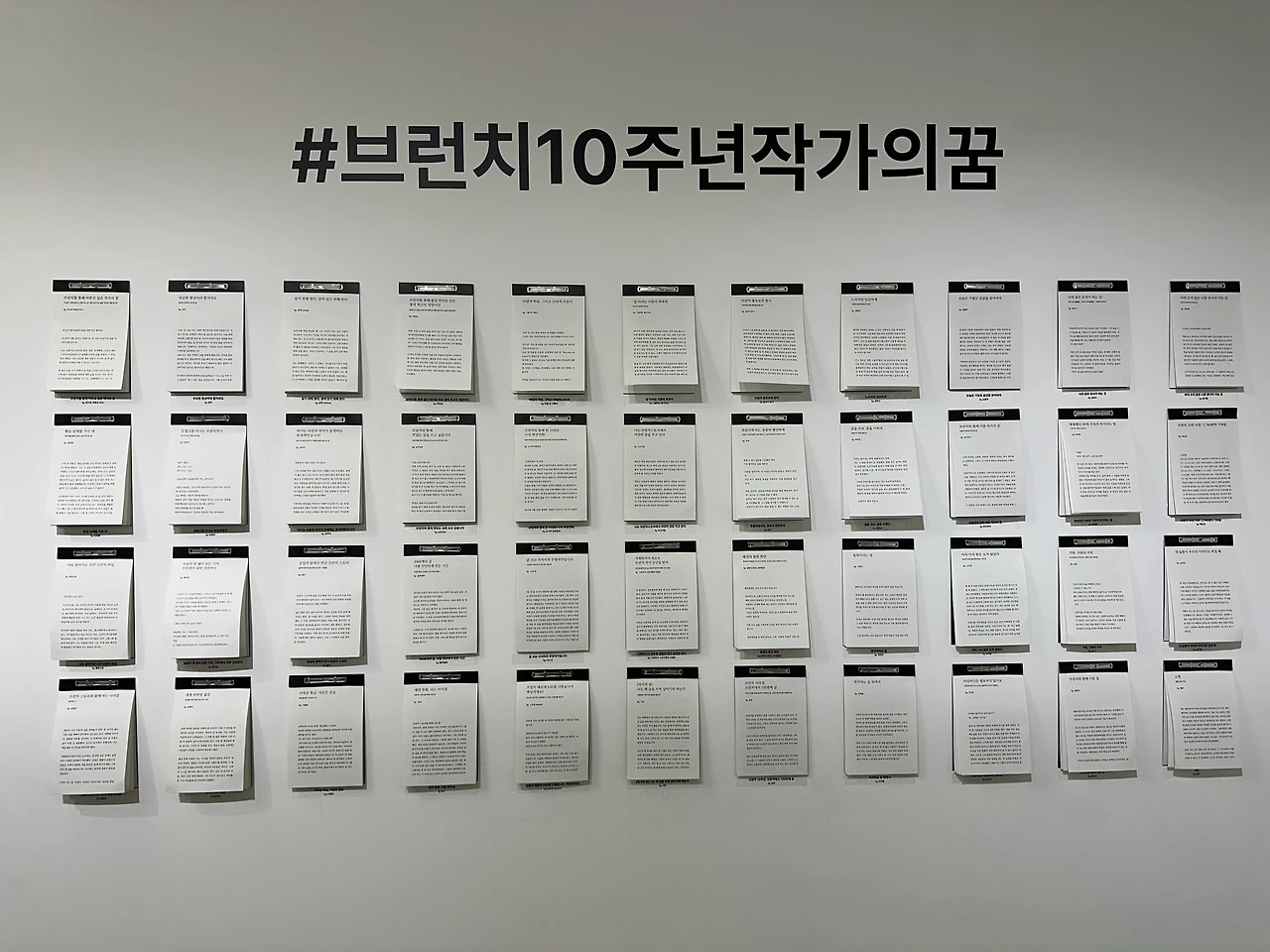 브런치가 벌써 10년이 되었다. 그동안 난 그저 눈팅만 했고, 작가에 도전했다가 탈락하는 경험을 세 번도 넘게 했던 것 같다. 그렇게 뒤늦게 브런치 작가 대열에 합류했고, 몇 분이 읽지 않더라도 매일 글을 발행하려고 노력하고 있다. 비록 100명을 뽑는 공모에서는 탈락했지만 그럼에도 과연 브런치 작가라는 사람들은 실존하는 것인지, 실제 뽑힌 사람들은 과연 어떤 사람들인지 궁금해서 10주년 기념 팝업 전시 첫날에 모든 일을 뒤로 미루고 참석했다.
