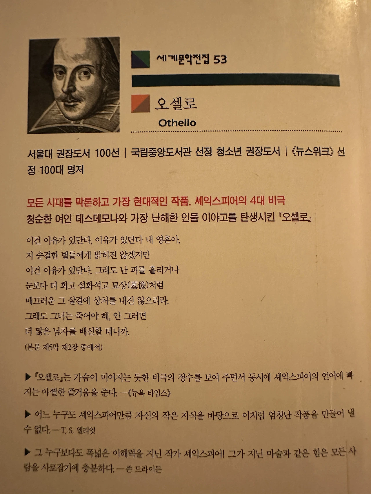 놀랍게도 성인이 되어서 그의 작품을 처음 읽었다. 그것이 바로 그가 인생 후반부에 써낸 희곡 <오셀로>다. 최종철 번역, 민음사 판본으로 읽었다.