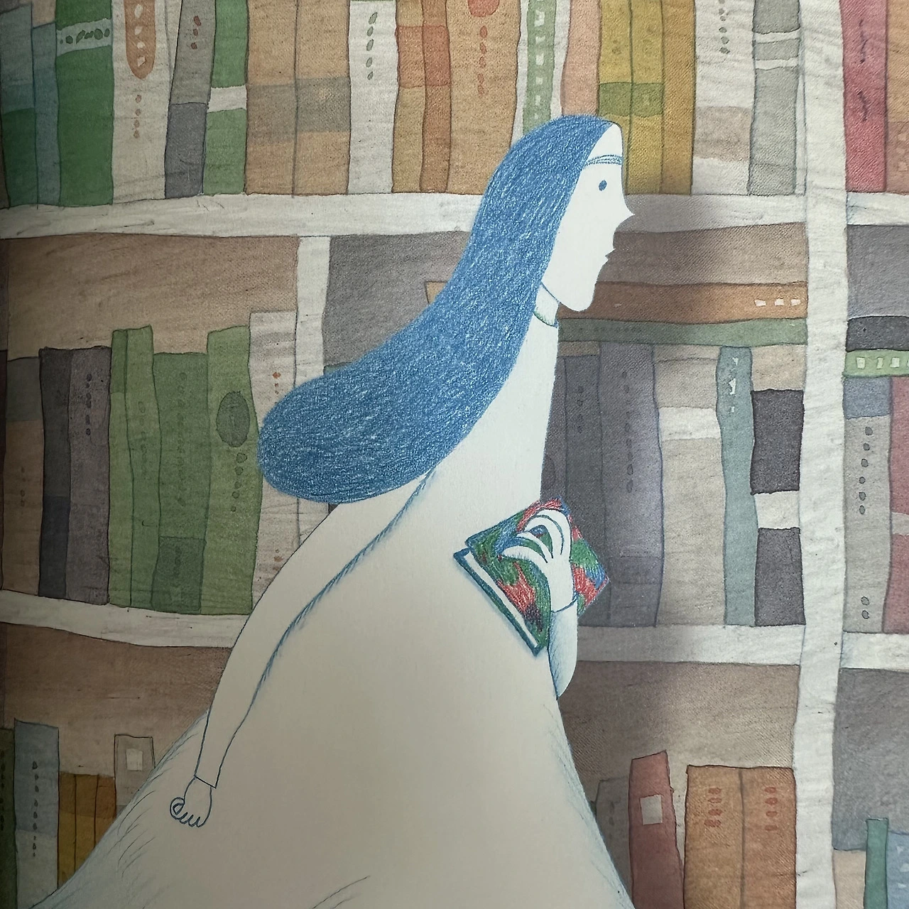 시 그림책의 전체적인 그림은 시와 잘 어울린다. 한 줄 한 줄 시가 진행되며 어떤 여성은 걷기도 하고, 눕기도 하고, 한숨을 쉬다가, 또 갑자기 어딘가 붕 떠오르기도 하고, 결국 거대한 책장과 수많은 책이 있는 서가에서 책을 고른다. 아마도 시집인 것 같다. 그리고 또 하염없이 걷는다. 밝은 곳에서 어두운 곳으로, 복잡한 곳에서 한적한 곳으로, 사람이 없는 곳에서 사람이 있는 곳으로, 혹은 그 반대로, 구름 위로, 강물 위로 어디로든 걸으며, 혹은 멈춰서 책을 읽는다.