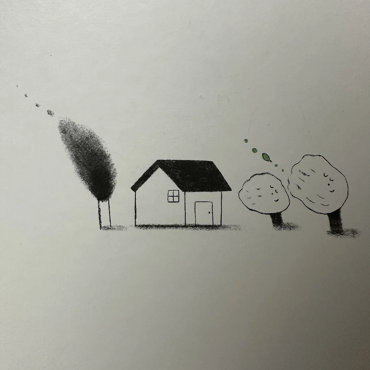 뒤표지에는 나무 세 그루, 그리고 외딴집이 있다. 누가 사는 집인지 궁금하게 만든다. 앞면지에도 역시 집 한 채와 나무 몇 그루가 띄엄띄엄 있고, 뒷면지에는 편안한 표정의 소녀가 걷고 있으며, 집에는 다른 소녀가 얼굴을 감싸고 있다. 어딘가 힘들어 보인다. 특이한 것으로 집 앞에 빨간 사과가 놓여있다.