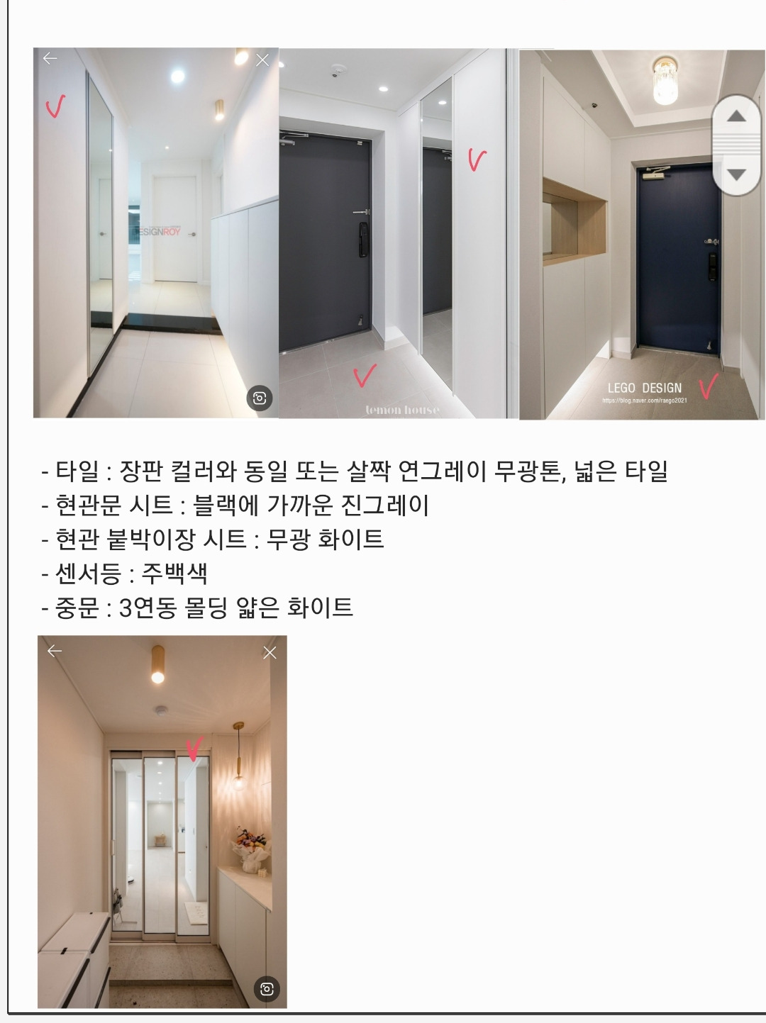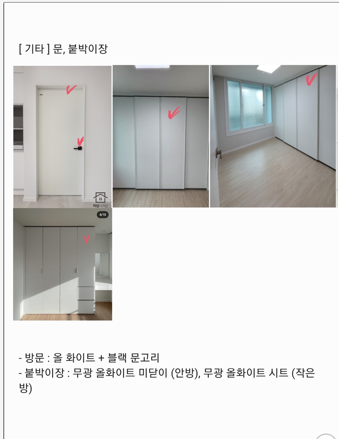 고작 문짝부터 문고리, 문선 하나까지도 모든 것이 비용과 직결되기 때문에 미리 하나하나 정해놓는 것이 좋다. 또한 최대한 상세하게 내가 원하는 스타일을 정리해 놔야 원하는 대로 구현될 수 있다.