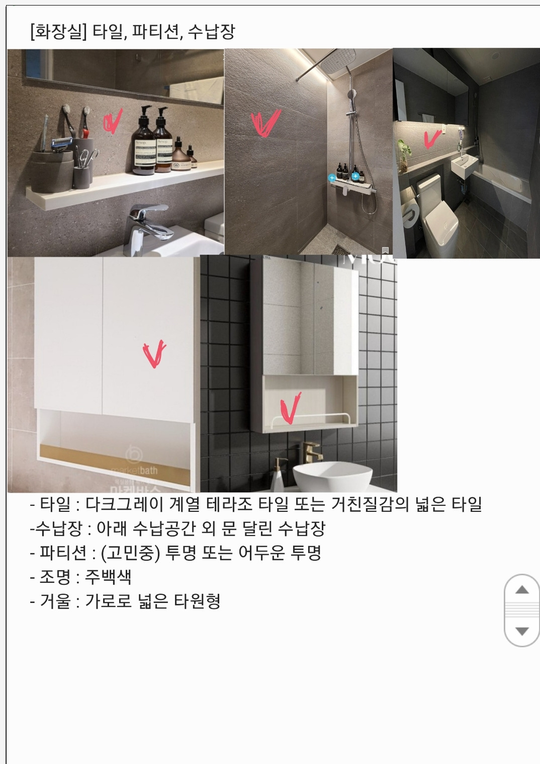 타일은 크게 가로세로 너비에 따라 종류가 결정된다. 타일의 너비감이 집을 더 넓어 보이게 하는 것 같아 600 타일을 골랐다. 그 외에도 조명부터 붙박이장, 문틀까지 업체와 미팅 전 최대한 상세하게 준비했다.