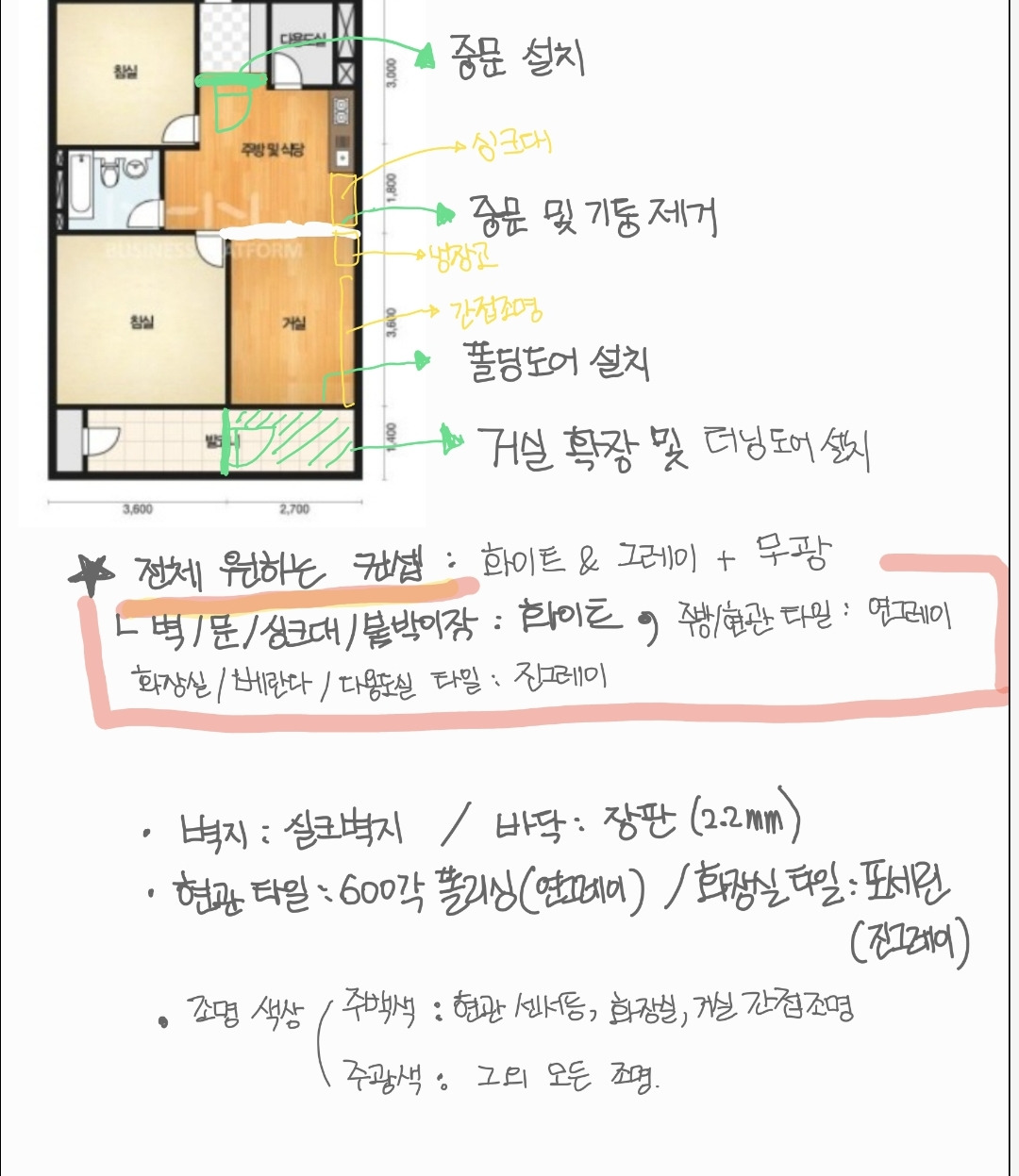 먼저, 집 평면도와 함께 원하는 전체적인 큰 가닥을 정리했다. 추가 비용이 들어감에도 놓칠 수 없던 현관 중문 설치, 베란다-거실 확장 및 폴딩도어 설치와 거실과 주방 사이에 있던 문과 벽 제거하는 것을 평면도에 표기해 두었다.