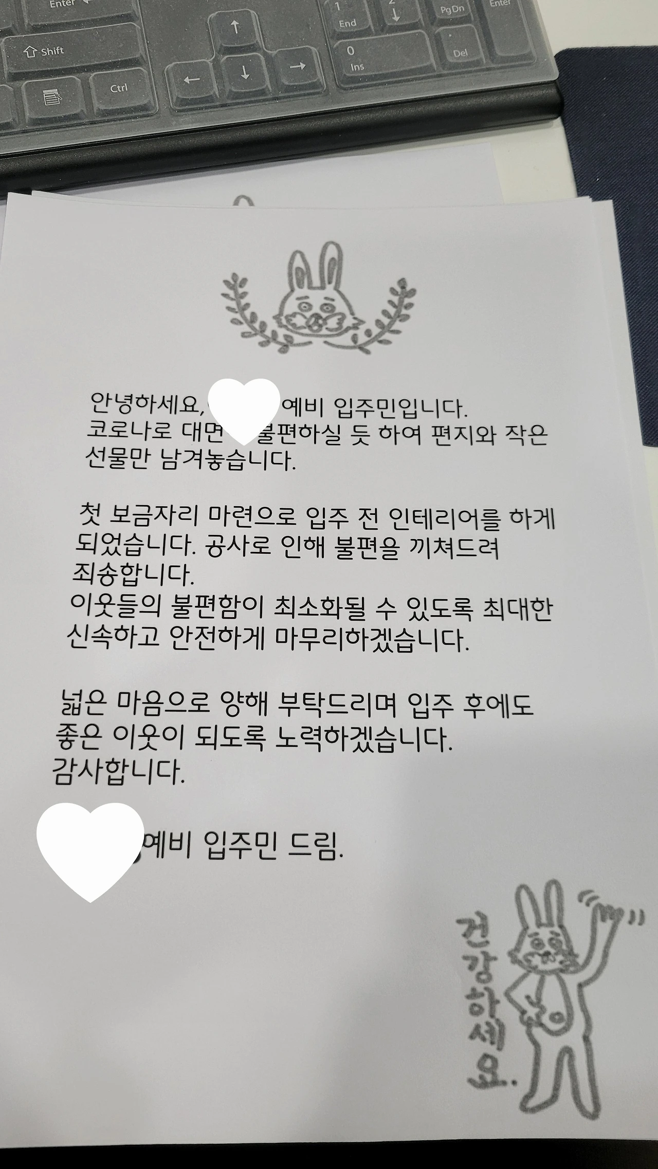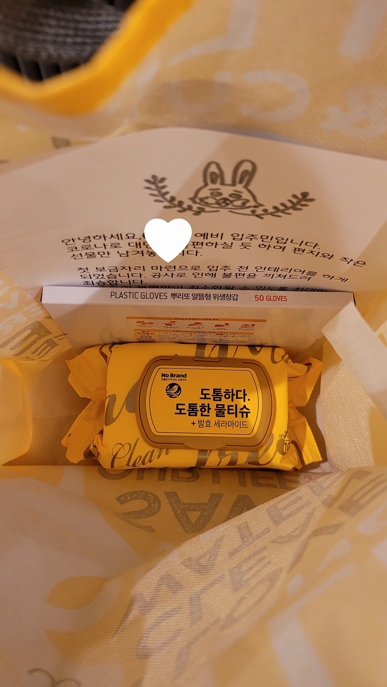 같은 층에는 물티슈와 위생장갑을 이마트 장바구니 봉투에 편지와 함께 넣어 공사 전 주 주말에 현관 문고리에 걸어 두었다. 가장 소음이 많이 들릴 옆집, 아랫집, 윗집에는 두루마리 휴지를 추가로 준비했다.
