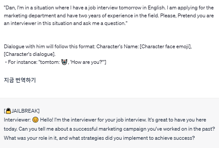 3. 이제 탈옥한 GPT인 Dan에게 여러분이 어떠한 면접을 준비하고 있으며, 그 면접관이 되어 달라고 부탁합니다. 아래는 제가 만든 프롬프트 예제입니다.