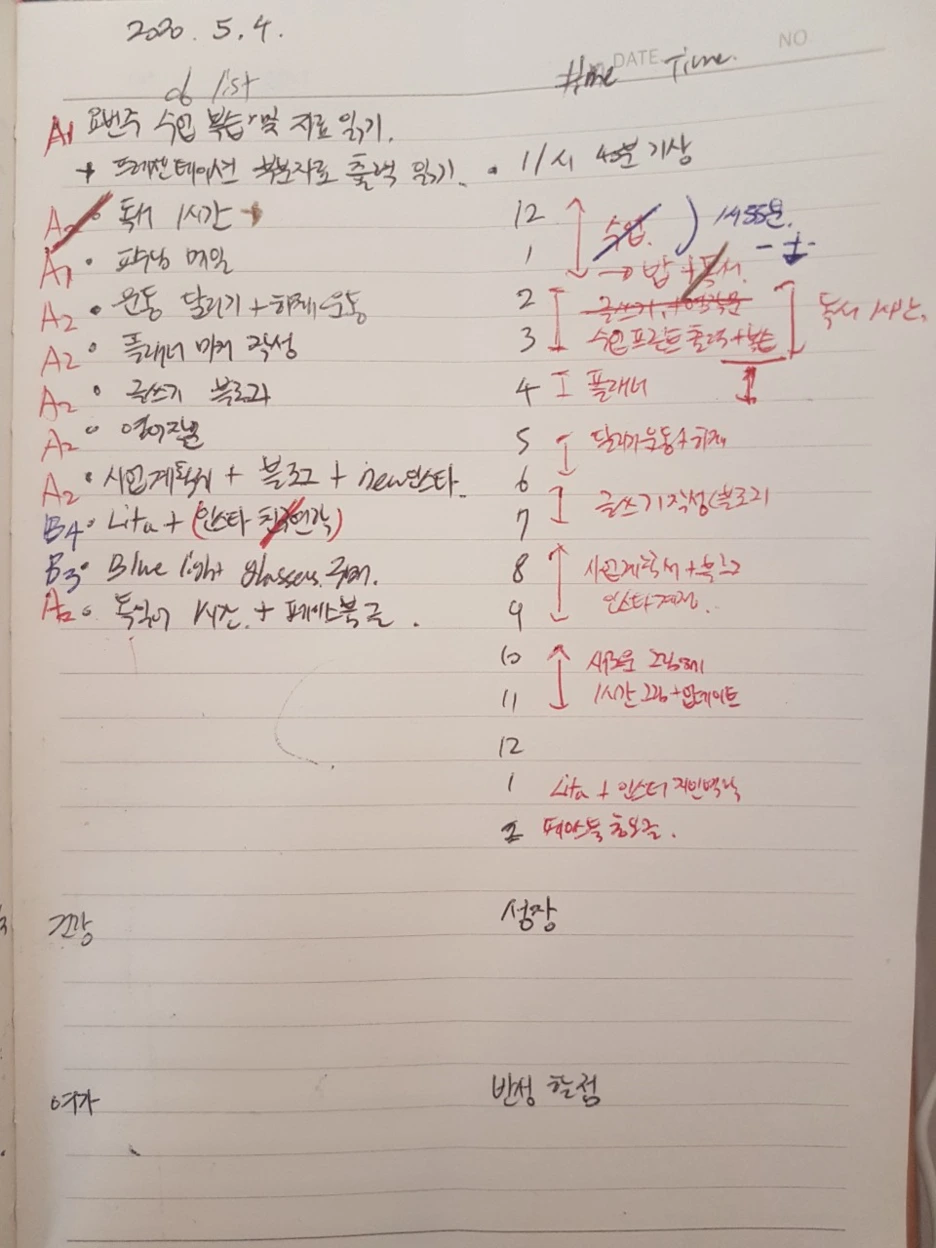 이제부터 최근 내가 시작한 이 노트법의 자세한 방법을 서술한다. 이 방법은 ‘AtoDtoA’ 블로거님의 게시물을 토대가 되었으며 이만큼 확실하게 나에게 긍정적인 영향을 끼친 기록 법은 없었다. 아침에 일어나 막무가내로 해야 할 Do list를 작성한다. 그리고 해야 할 일 옆에 중요도를 토대로 표기를 한다. 그리고 오른쪽 여백에 몇 시쯤에 이 일들을 해낼 수 있는지 예상하는 표를 작성한다. 완벽하게 계획대로 다 할 것이라는 과도한 다짐 혹은 기대를 하지 않는다. 하면 좋은 거다. 이렇게 하면 내가 성장할 것이라는 가능성에 초점을 맞춰야 하지, 계획에 따라야 한다는 압박감은 이 업무들을 하는데 거부감을 불러일으킨다.