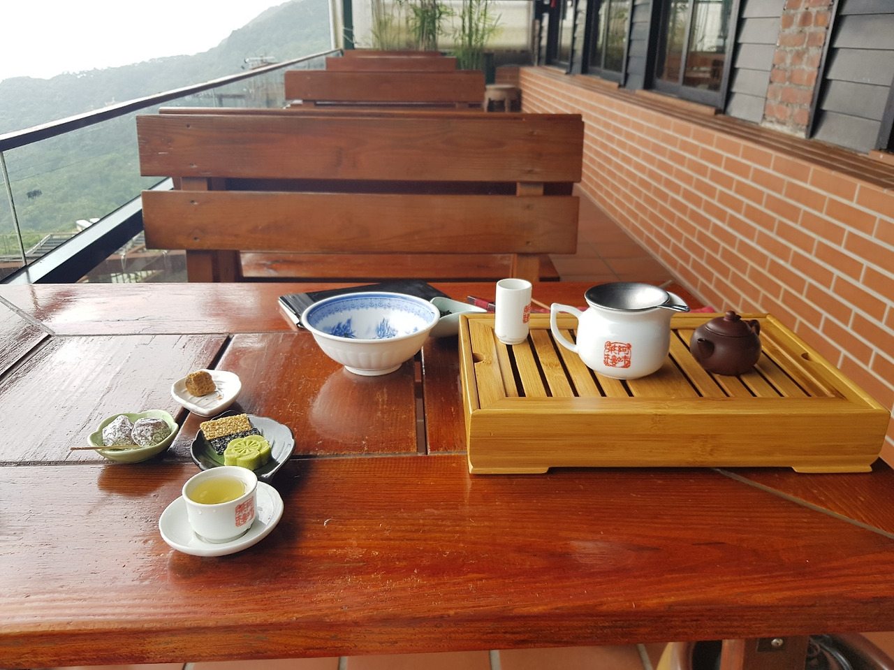 곧 비가 내릴 듯 안개 가득한 산 공기에 둘러싸여, 저는 이날 아메이차루 첫 손님으로 철관음(鐵觀音)을 마셨습니다. 좋은 철관음이 생산되는 타이베이 목책지구(木柵地區)에 가지 못하는 한을 이곳에서 풀었습니다. 여기서는 술잔처럼 생긴 길쭉한 잔을 주는데, 이 형태의 잔이 차향을 맡기가 참 좋아요. 이어서 찻잎을 듬뿍 떠서 주고 옆에 뜨끈한 주전자를 하나 줍니다. 계속 물을 채우면서 차를 마실 수 있고, 간단한 다과도 곁들일 수 있지요.