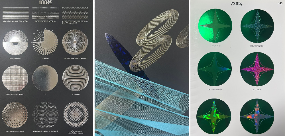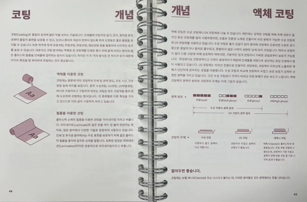 아, 복잡하다 복잡해. 여기서 또! 코팅의 종류에 따라 후가공의 종류도 결정 난다. 한 면에서 특정 부분만 반짝이게 하거나 박을 찍는 경우가 그러한데, 유광코팅에 또 반짝이는 무언가를 추가하는 게 좋은지 아니면 반짝이는 걸 전체적으로 눌러주는 다른 효과를 주는 게 좋은지. 아니면! 반대로 무광코팅에 반짝이를 포인트로 추가한다던지… 또 거기에다가…