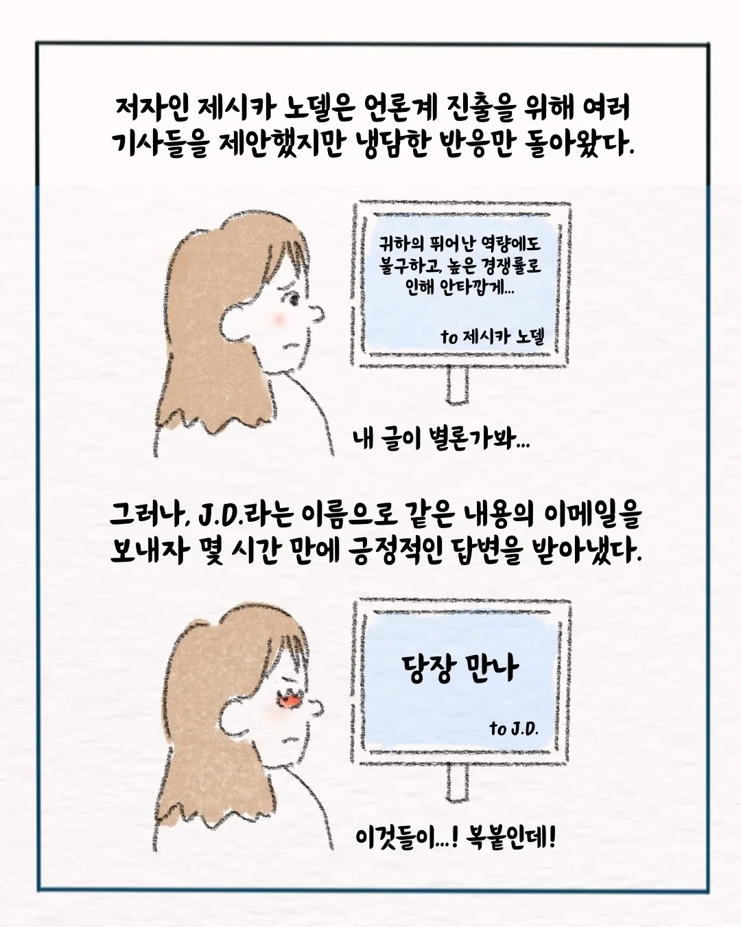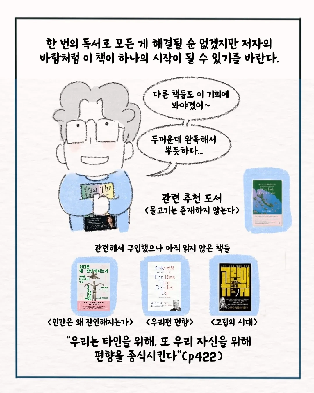 '책에 관한 만화'를 연재하고 있습니다. 책 읽기보다는 책 사는 걸 좋아합니다. 2015년부터 한 독서모임의 모임장으로 지내고 있습니다. 책에 대한 이야기를 꾸준히 그리겠습니다.